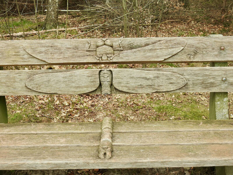 Een mooi stukje houtbewerking, deze libelle uitgesneden in een bankje.