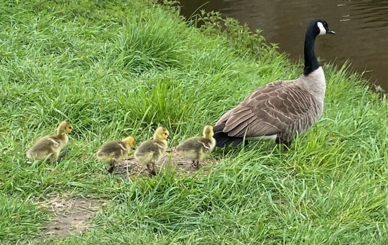 Een Canadese gans met 4 jongen op weg naar het water van de Berkel in Zutphen.