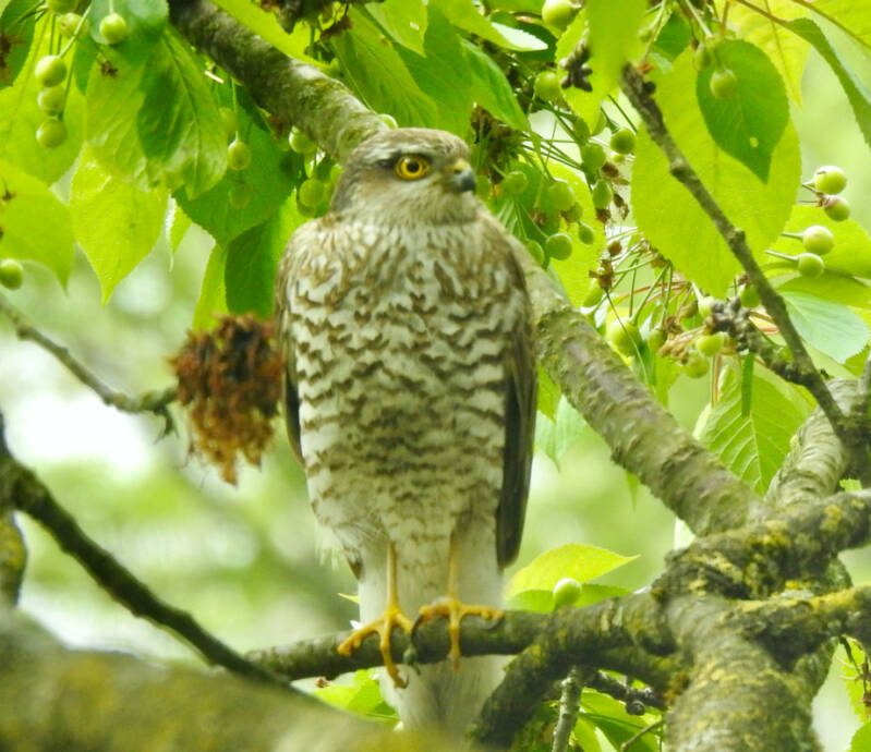 Sperwer in de kersenboom bij de buren, loeren naar de mezen. Foto minder scherp, door het raam genomen.