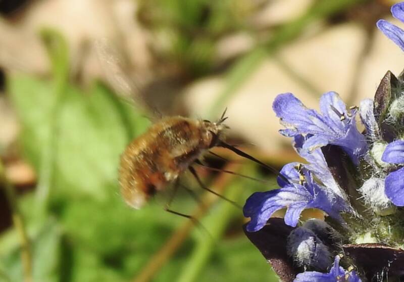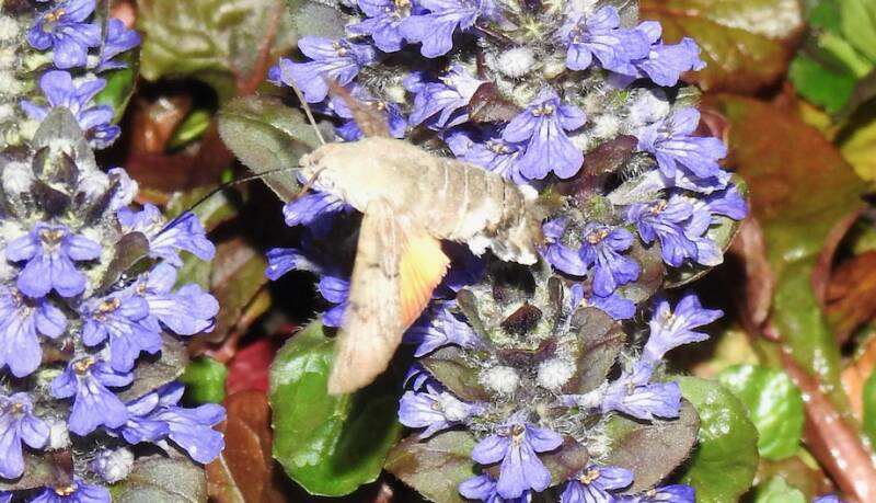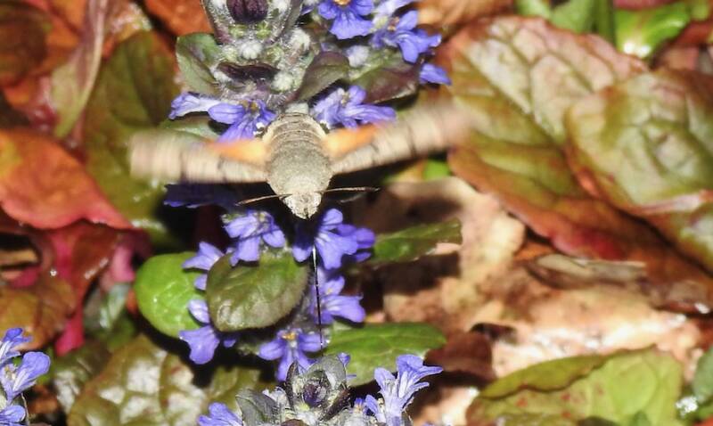 Vorige week op een avond in de schemering zagen we een kolibrievlinder in onze tuin honing zuigen uit de bloemen van het kruipende zenegroen. Die heeft paarse bloemen, een kolibrievlinder heeft kennelijk voorkeur voor paarse bloemen, in Marokko zagen we ze altijd op paarse bloemen. In Nederland schijnt deze vlinder tamelijk zeldzaam te zijn