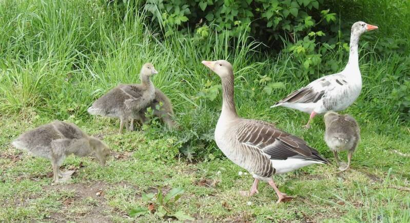 De jonge grauwe ganzen worden al wat groter. Benieuwd welke kleur ze uiteindelijk zullen krijgen als deze groot zijn. Van oorsprong is de grauwe gans een trekvogel maar een groot aantal blijft nu in Nederland. Hij komt nu erg veel voor in Zutphen en omgeving.