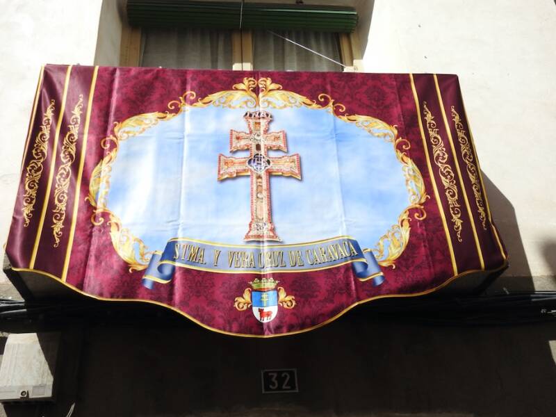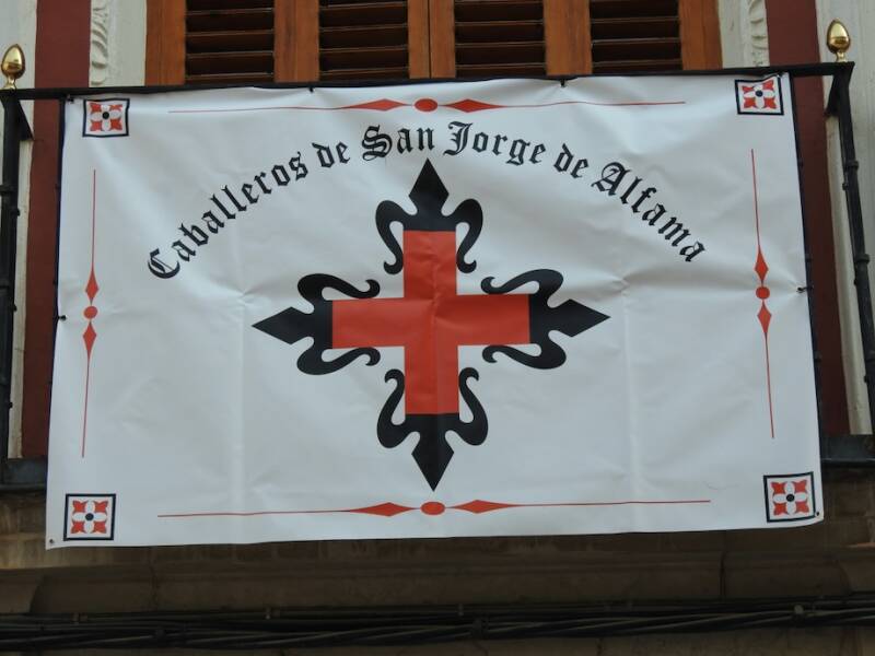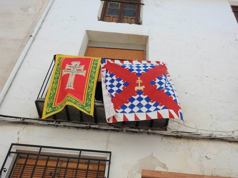 Een levensgroot spandoek waar de Caballos del Vino op wordt aangekondigd. Boven op de kasteeltoren zie je nog het twee-armige kruis.