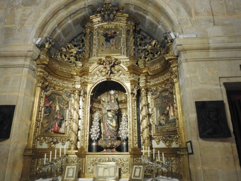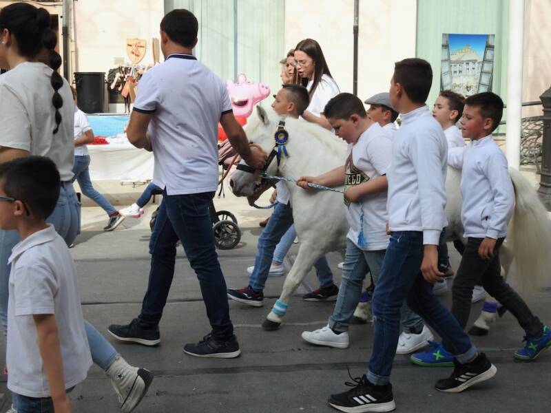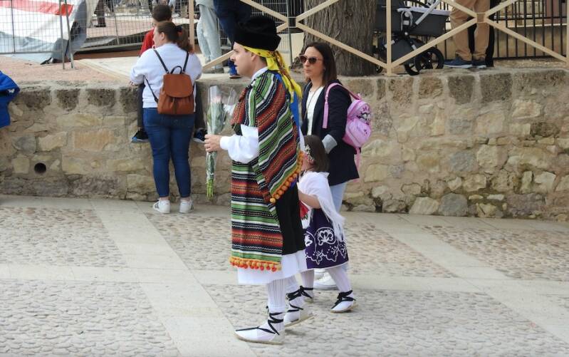 Bij de parochie beleefden we het omgekeerde als bij de basiliek, minder mooi van de buitenkant maar wel met een prachtig interieur met diverse kapellen. Dat minder mooi van de buitenkant hou je niet vol als je er van boven bij het kasteel op kijkt. We zijn nog door de feestelijk met doeken met kruizen, vlaggen van tempeliers, versierde straten gelopen. Op verschillende plaatsen in de stad staan tribunes waar je een kaartje voor kunt kopen om oa de ‘wijnpaarden’ en Moren en Christenen voorbij zien trekken. Ook is er een kinderoptocht op een van de eerste feestdagen, het feest van de Caballos del Vino duurt een hele week. Het was vandaag weer een stralende dag met een enkel wolkje en met 21º een stuk lekkerder dan gisteren.