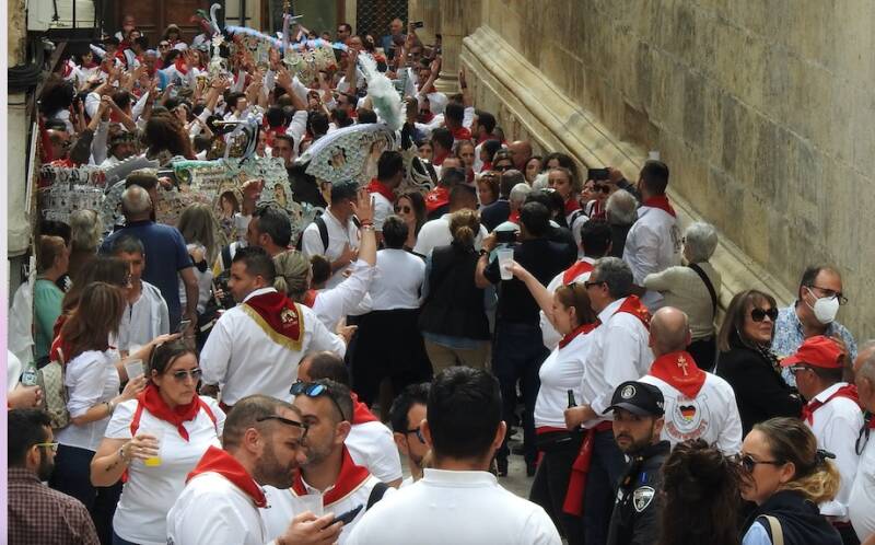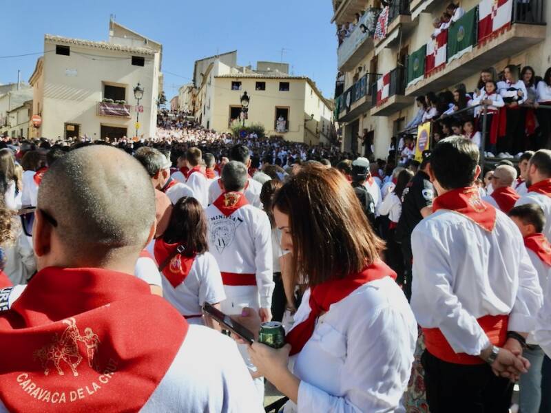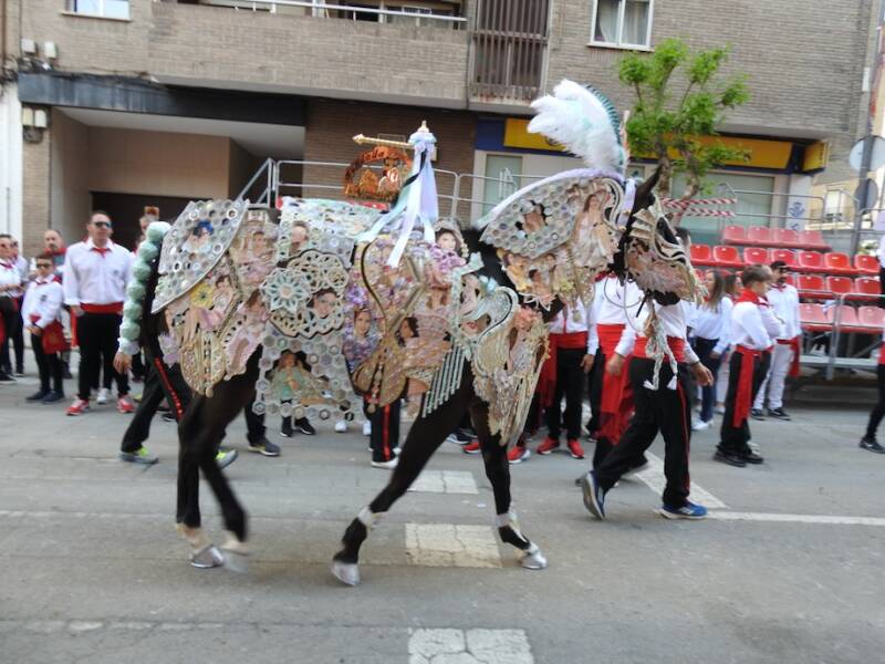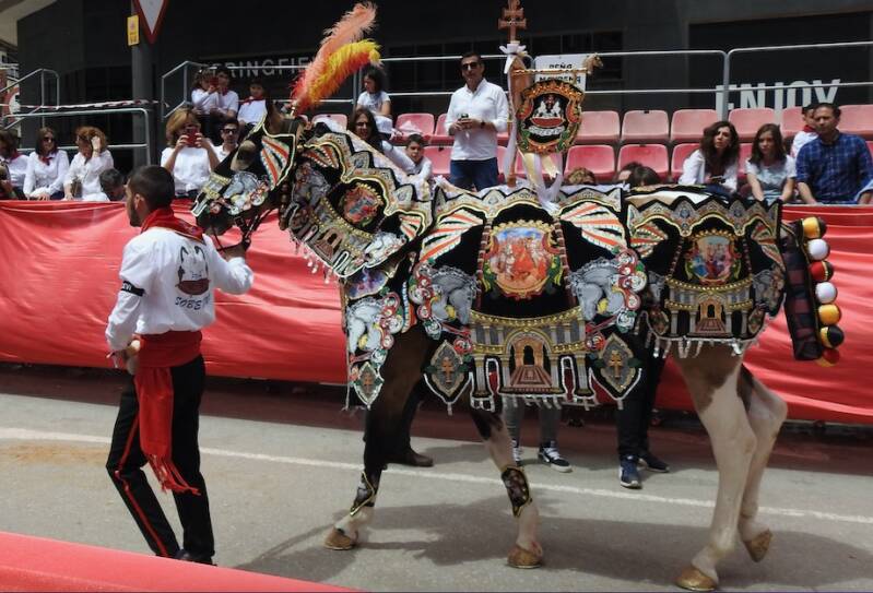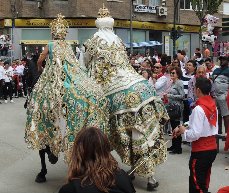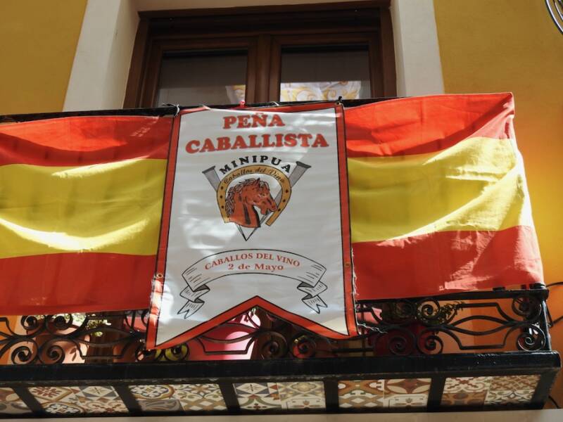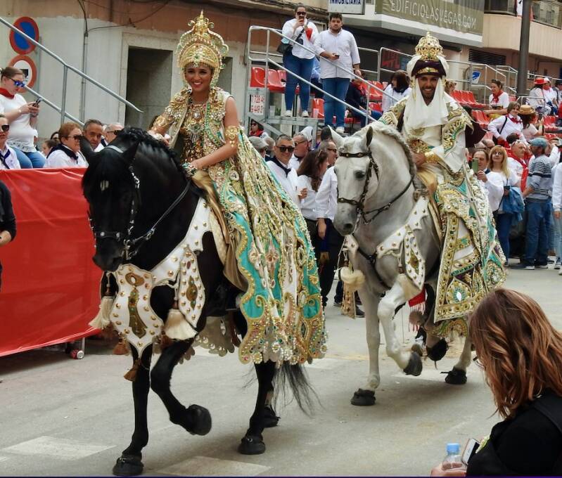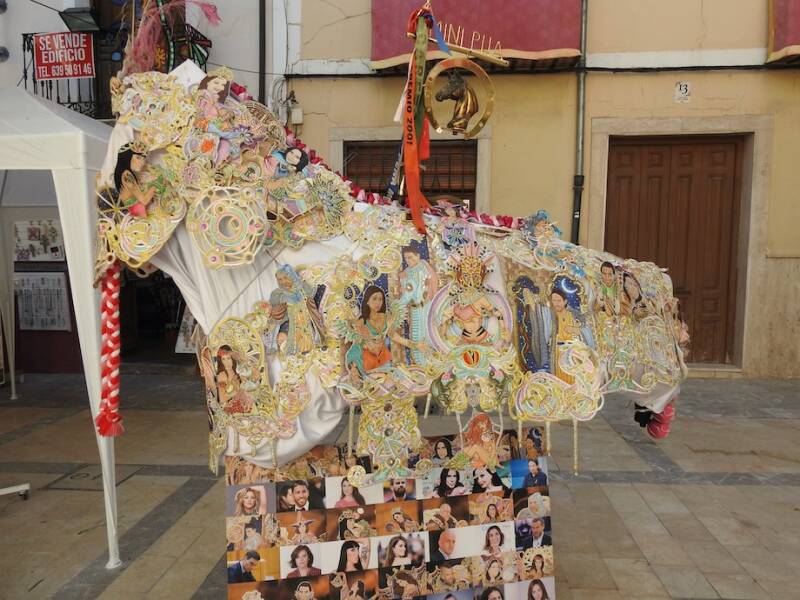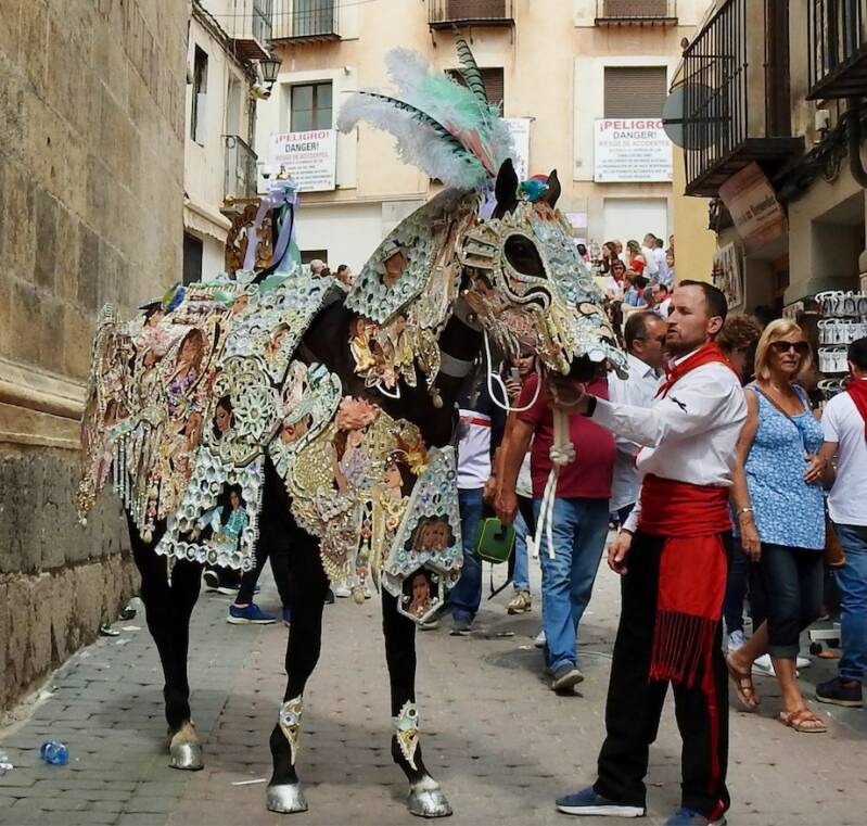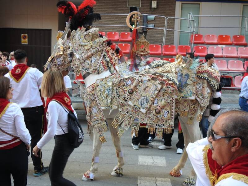 Een paar jaar geleden hoorden we van een bijzonder feest in Caravaca de la Cruz toen we een gezellige avond met campervrienden in Cullera hadden. Adrie en Rob vertelden enthousiast over de Caballos del Vino, een kleurrijk feest in Caravaca de la Cruz en we namen ons voor dat een keer bij te wonen. Voordat we een plekje hadden gevonden na een mooie rit door de uitlopers van de Sierra de Espuña, had dat nog wel wat voeten in de aarde. We moesten door erg nauwe straatjes, een ervan was zo nauw dat we aan beide kanten 2 cm ruimte over hadden tussen geparkeerde auto’s en een muur, een toeterende rij auto’s achter ons als gevolg omdat we stapvoets moesten manoeuvreren. Uiteindelijk komen we nog even nabibberend aan op de plek waar we dachten te gaan staan ,bleek er een kermis te zijn. De volgende mogelijke plaats ingevoerd in de TomTom, minder nauwe straatjes voerden ons naar een parking met een prachtig uitzicht op ‘het kasteel’ oftewel de basiliek. Wel veel hondenstront en een paar grote tenten op 200m afstand waar ze net de geluidsinstallatie begonnen te testen. Dat gaat hem niet worden dachten we, eerst maar eens langs de officina de Turismo om naar een geschikte plek te vragen. We kregen een andere plek die tijdens de feestdagen als parkeerplaats geschikt is gemaakt, een gemaaid grasveld. We vroegen nog of de muziek ’s nachts lang doorging, “mijn dochter kwam vorig jaar om 6 uur thuis”, zei de mevrouw.