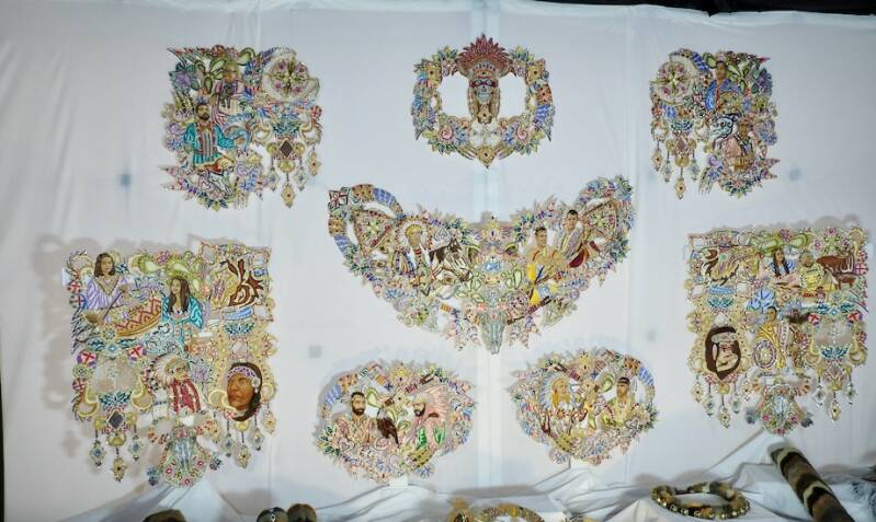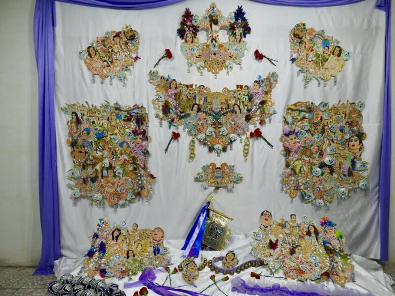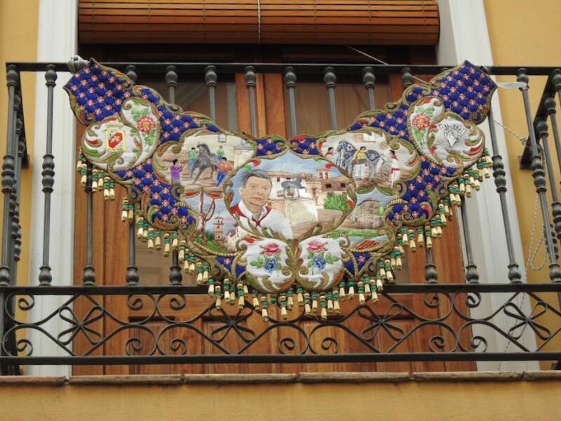 Her en der langs gevels of balkons de geborduurde kleedjes van voorgaande jaren.