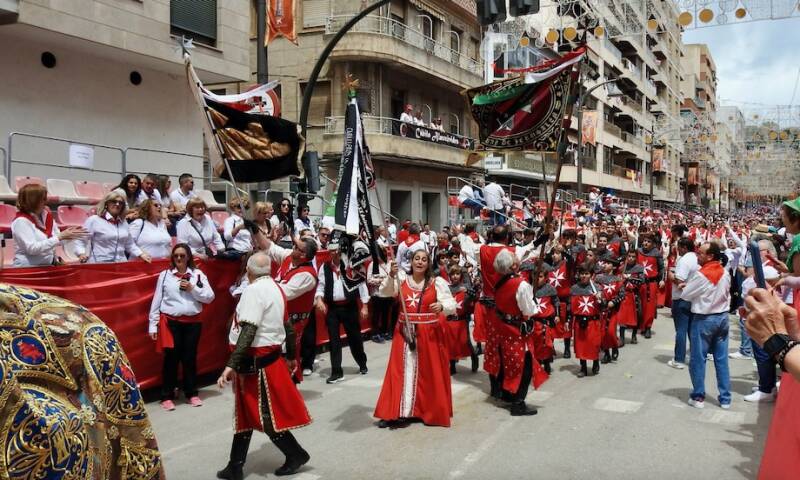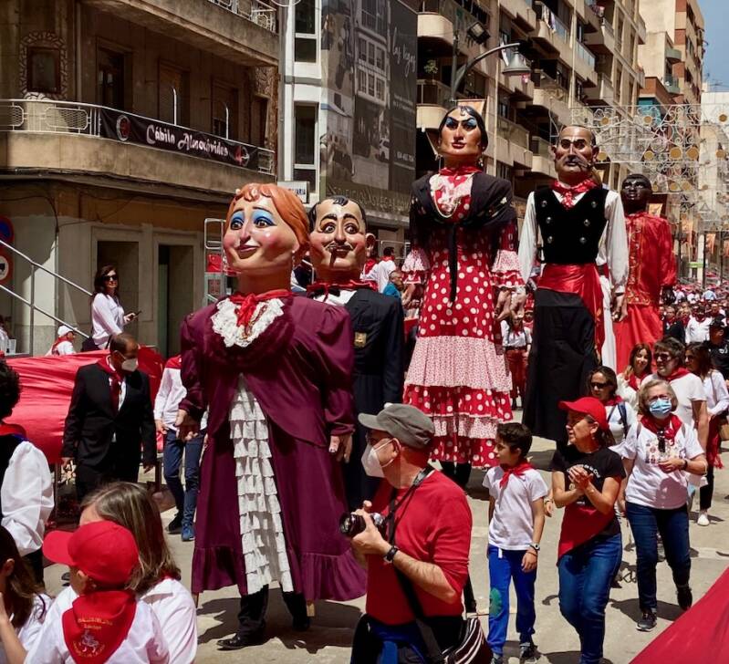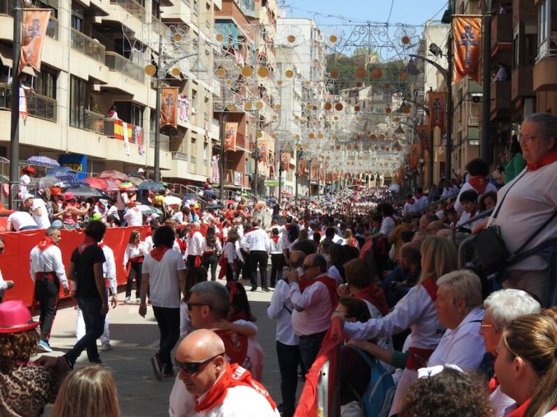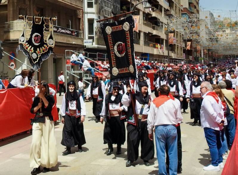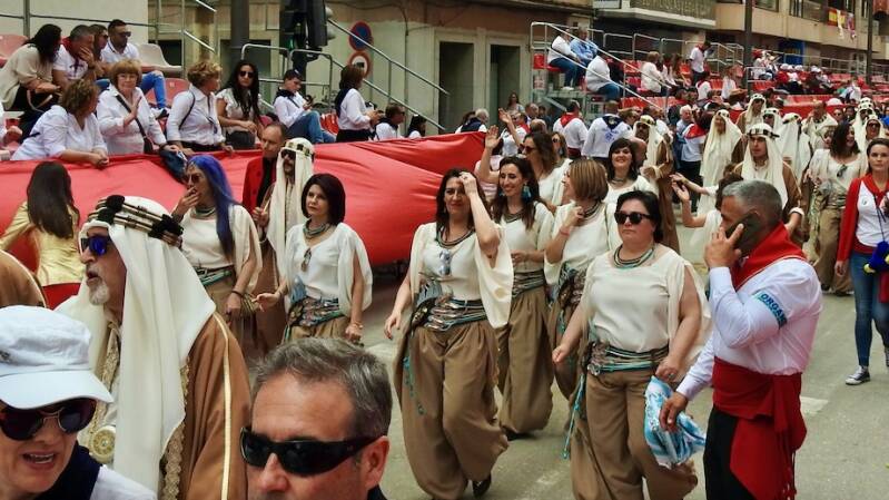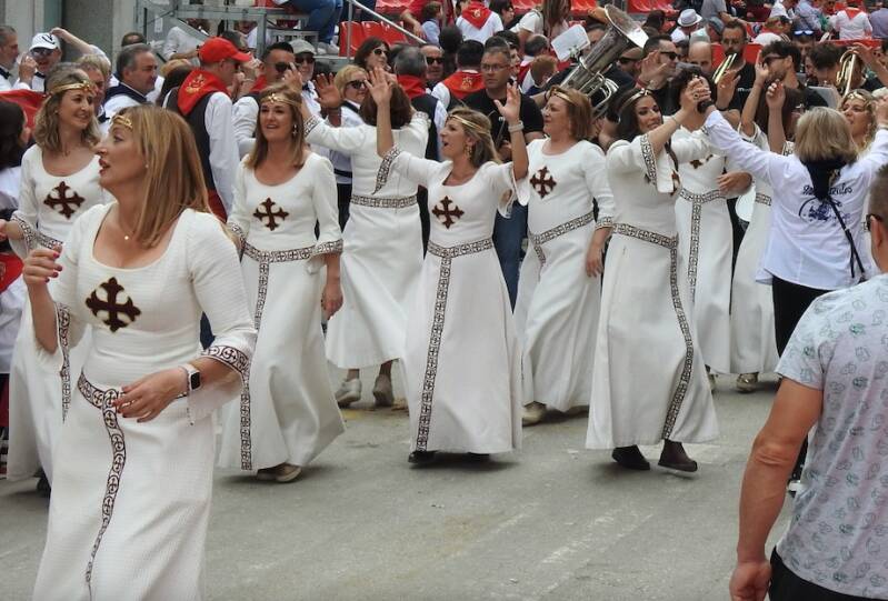 Maar eerst waren er nog Moros y Christianos die zich verzamelden om 12.00 uur op het Plaza de Templete. Bij navraag bleek dat zij ook langs de tribunes zouden komen dus hebben we ons daar weer genesteld. Een onafgebroken stroom mensen, afgewisseld met muziekbands en Caballeros del Vino trok voorbij, vrolijk zingend en dansend, een uitstekende sfeer. Deze optocht ging over in die van de Moros y Christianos, de Moren en Christenen. Overal in Spanje wordt nog het einde van de overheersing van de Moren gevierd, daar zijn geen vaste data voor, dat is in iedere stad weer anders. Ook worden er dan gevechten nagebootst, dat zal hier vanavond zijn. Groepen verkleed als Moros dan wel Christianos, trokken voorbij in een eindeloze stoet. Af en toe stokte het omdat de straten verstopt zaten, en werd een deel van de stoet omgeleid. De tribunes waren niet dichtbevolkt, haast iedereen liep op straat.