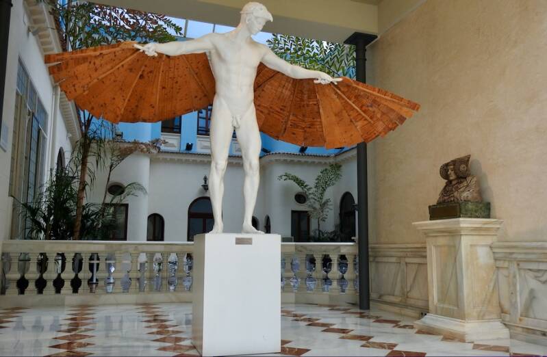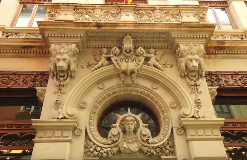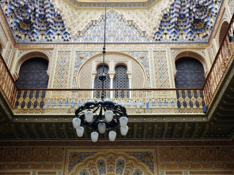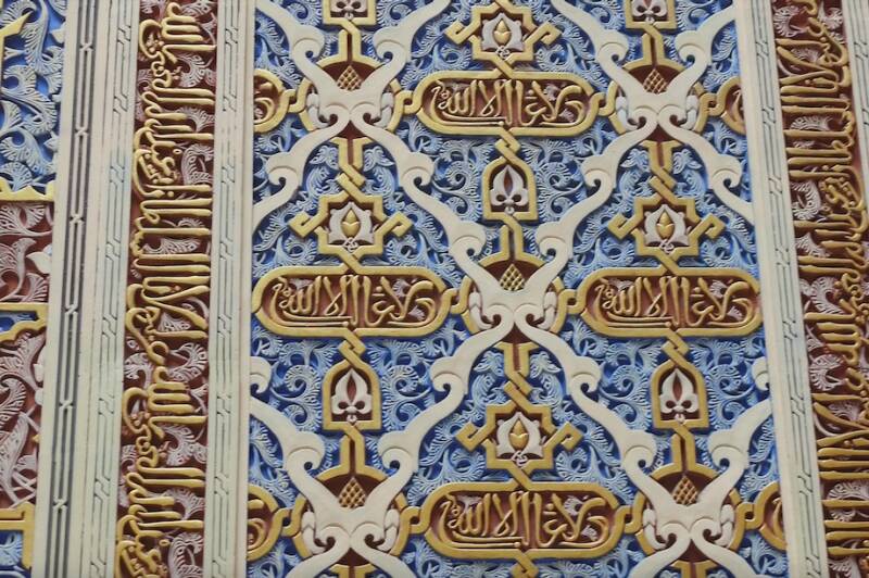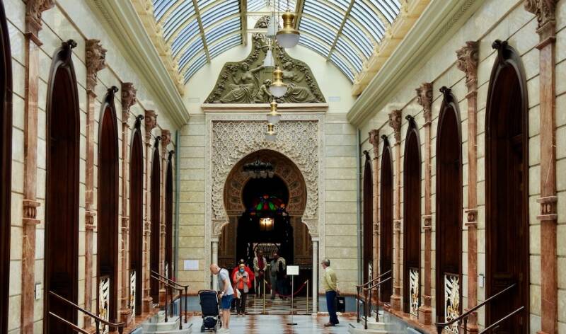 De met glas overdekte hal, de muren met marmer ,de arabische vormgeving, de boog van de patio net als een Marokkaanse poort.
