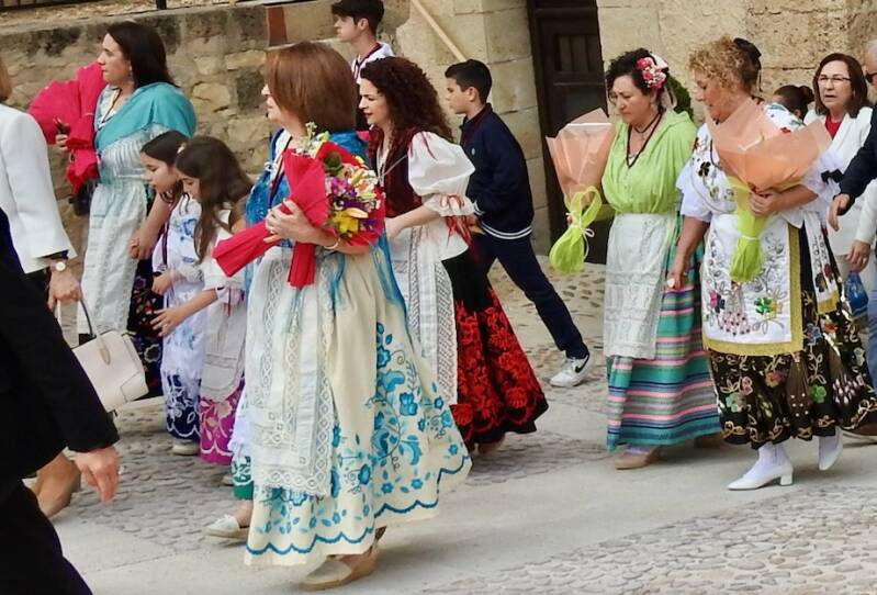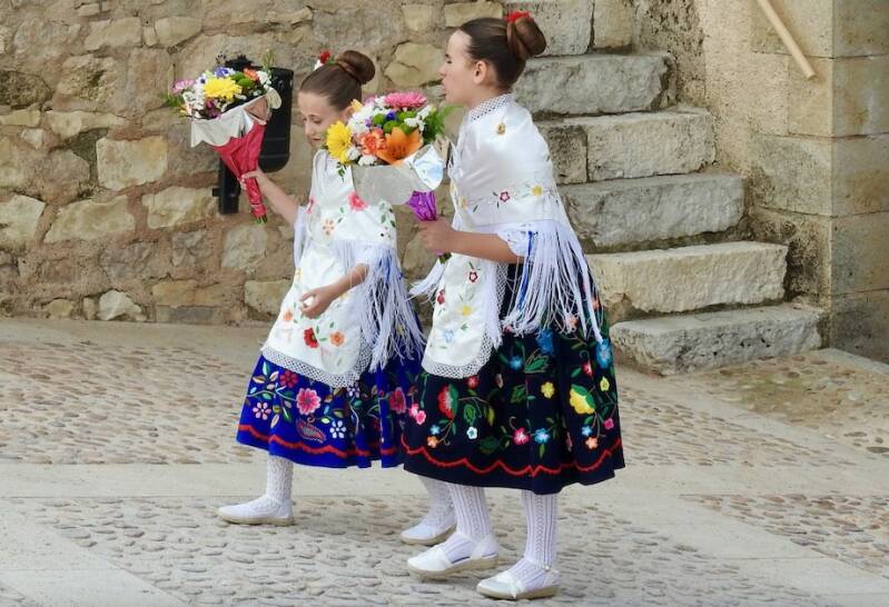 Meisjes , traditioneel gekleed en met bloemen, op weg naar het kasteel.