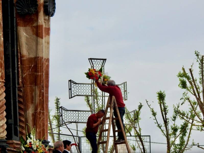 We zijn vanmorgen om 11 uur de stad ingegaan en naar het kasteel gelopen. Daar begon nl om 12.00 uur een religieus ritueel in het kader van de feestweek. Voor de basiliek was een groot dubbel-armig ijzeren kruis neergezet en de bedoeling was dat deze helemaal aangekleed zou worden met bloemen. Op de weg naar boven liepen wij al tussen veel mensen, sommigen traditioneel gekleed, de meesten met een bos bloemen bij zich. Bij het kasteel zijn we op een muurtje gaan zitten en hebben ons vermaakt met het voorbij zien trekken van een grote schare gelovigen, zoals gezegd de meesten met mooie bossen bloemen. Ook kleine kinderen waren soms feestelijk traditioneel gekleed. Om 12.00 uur begon een koor mooi te zingen, enige mannen beklommen een hoge trap en gaven bloemen door aan de bovenste man die ze in het kruis stak. Ondertussen declameerde een dame de namen van talrijke hoogwaardigheidsbekleders die bloemen hadden geschonken, totdat wij vonden dat we genoeg hadden gezien en weer naar beneden afdaalden waar het lekker druk was in de straten.