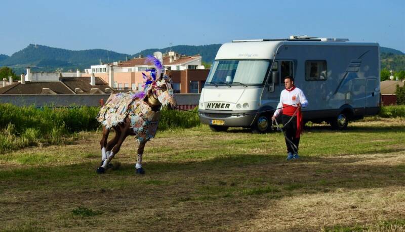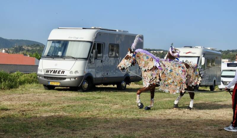 Vanmorgen om 7 uur werden we ruw gewekt door knalvuurwerk wat een minuut of 10 duurde, dan ben je meteen klaar wakker. Net toen we ons gewassen hadden om ongeveer 8.30 uur, hoorden we een muziekkorps. Nu is hier tegenover de tijdelijke parking een verpleeghuis en daar marcheerde een korps over het terrein met warempel ook een Caballo de Vino in vol ornaat. Ik spoedde me erheen, gewapend met een fototoestel, maar het paard werd het grasveld op geleid en werd vlak voor onze camper gelongeerd.