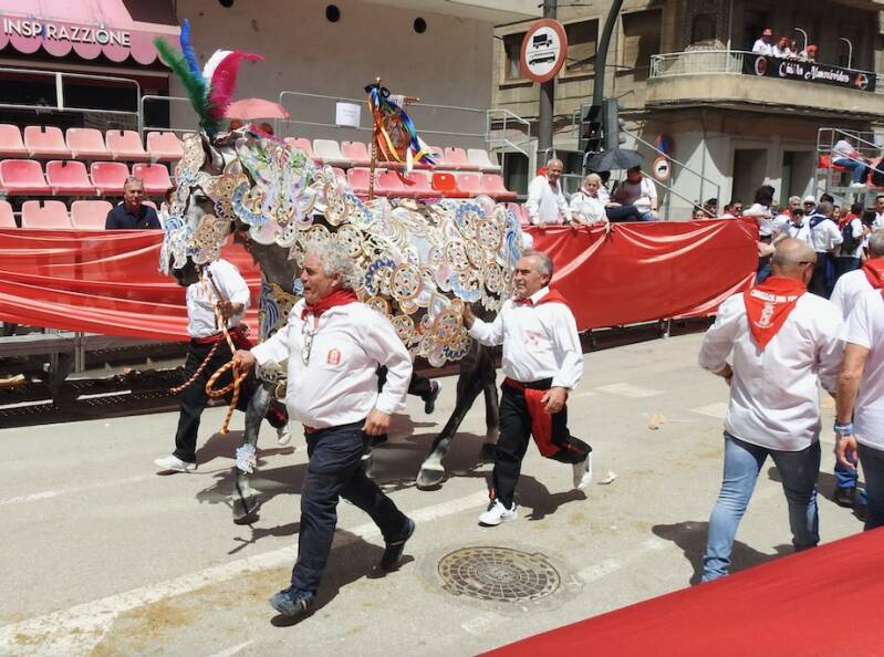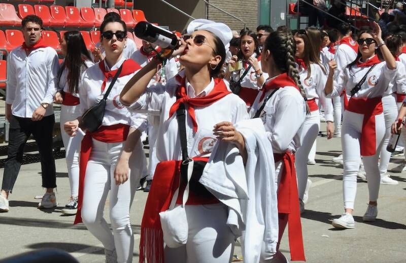 Zoals gezegd hadden we een kaartje, een polsbandje voor de tribunes, maar dat bleek helemaal niet nodig. Althans er was helemaal geen controle de hele dag niet. Maar we hebben een flink aantal paarden gezien die voorbij kwamen in een soort defilé. Er was een enorme mensenmassa op de been en het viel op hoeveel mensen er met een fles wijn of blikje bier liepen, om 9.30 uur al. De meeste mensen, eigenlijk alleen een enkele toerist niet , waren geleed in wit overhemd, zwarte broek, rode sjerp om het middel en een rode halsdoek, vaak met een fles wijn in de hand.