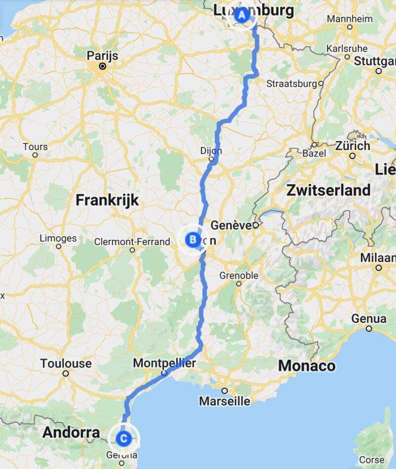1ste deel: onze eerste stop in België Arlon(A) , daarna Frankrijk, Oingt(B) en de derde dag in Spanje (C), La Jonquera
