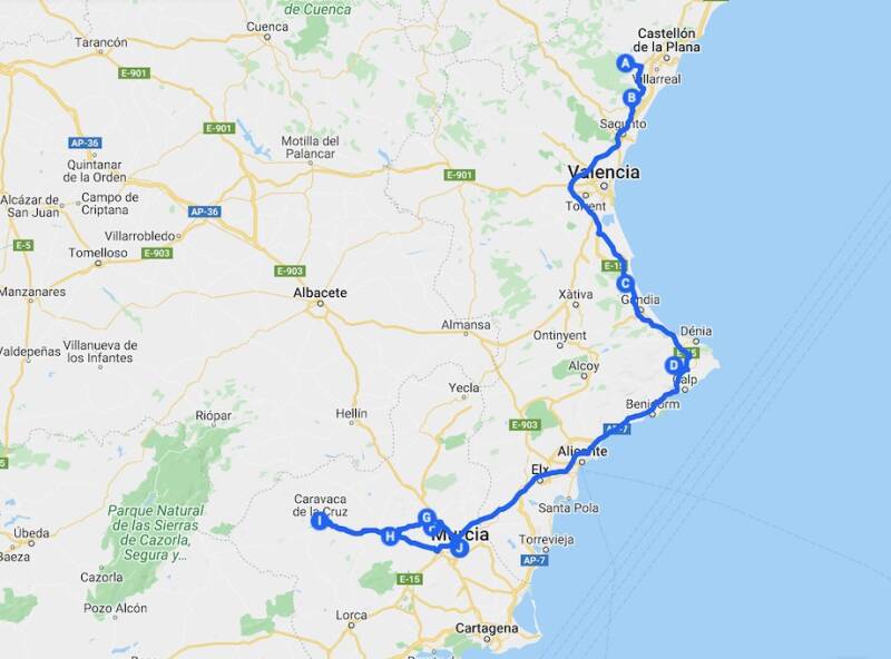 Aan het Bellugaplein, wat een belangrijke ontmoetingsplaats is voor inwoners van Murcia, staat ook het wat pompeuze gebouw, het bisschoppelijk paleis, dat sprak ons minder aan. We hebben door wat winkelstraten geslenterd en zijn bij de rivier de Segura gaan kijken waarna we naar het aardige plein Plaza de los Flores zijn gegaan. Van een Spanjaard kregen we de tip om daar te gaan eten bij een van de restaurantjes. We hebben gekozen voor het Pincho en tapasrestaurant El Secreto wat achteraf een goede keuze bleek. Inktviskroket, geitenkaaskroket, Ravioli van courgette met een gamba gegratineerd met Goudse kaas, dat waren de kleinere tapa’s. We namen ook nog patatas bravas en in tempurabeslag gefrituurde groenten met sojamayonaise , erg lekker allemaal. Als laatste een dessert, een Spaans wentelteefje met Baileys en nougat ijs. Wat ons altijd weer opvalt In Spanje en ook een beetje shockeert, zijn de vele bedelaars en daklozen die op een bankje slapen. Ook in Murcia weer de nodige gezien. We kennen het natuurlijk ook vanuit Marokko, wennen doet het nooit.