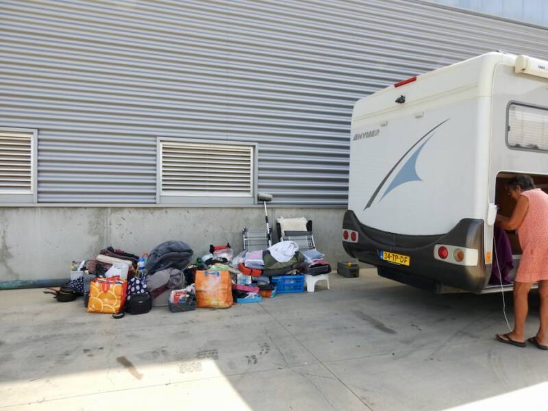 Dus vroeg uit bed en we waren oom een uur of half 10 bij de garage zodat we konden beginnen met het uitpakken van de spullen. De chauffeur kwam tegen half 12 en Everdien begon als een razende de spullen weer in te pakken in de nieuwe camper omdat om 13.00 uur de garage ging sluiten. Ondertussen moest ik met de chauffeur een procedure doorlopen, een niet onbelangrijk onderdeel daarvan is dat de eventuele schade aan de camper moet worden geconstateerd. Vlakvoor 13.00 uur was alles in orde, althans, de camper was ingepakt maar nog bijna niets lag goed op zijn plaats.