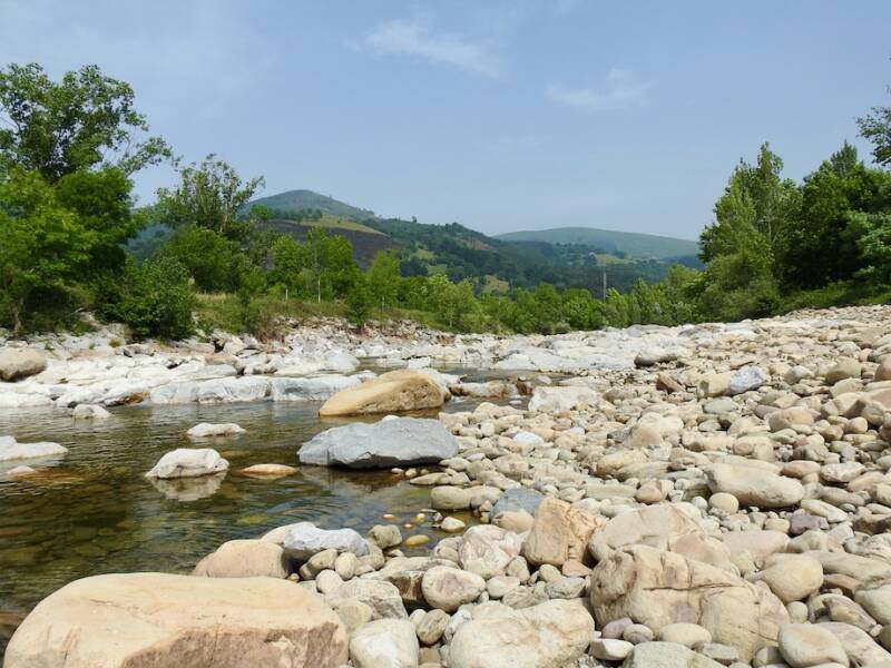 Het was ruim 100 km naar Ontaneda, we staan daar op een cp omringd door bergen , we staan zon 50km onder Santander. Er stroomt hier een riviertje vlakbij , we staan naast een boerderij, en er kwam vanavond een herder met geiten langs. We staan hier aan de stroom. Gisteren nauwelijks 12v gebruikt, een spaarzame lamp aan en toch was de huishoudaccu van 12,7v naar 12,5 v gedaald , we kunnen dus nauwelijks vrij staan. Everdien had een terugslag vandaag van het harde werken en de spanning van de afgelopen dagen, ze was erg moe. Dus ben ik alleen langs de rivier gaan lopen, weer nieuwe bloemen ontdekt en vlinders gespot. En heerlijk weer, 29º en een lekker windje.We blijven hier morgen ook nog wel, daarna zien we verder, de bedoeling was naar Bilbao maar de hitte komt ook die kant op. Dan wordt het wellicht wat anders, Bilbao zijn we vaker geweest. Er zijn hier 36 plaatsen met evenzo vele stroom aansluitmogelijkheden. Toch staan we hier maar met 3 campers. Er loopt hier ook een Via Verde langs, fietsen hebben we in de andere camper gelaten, vanmiddag heb ik er over gewandeld.