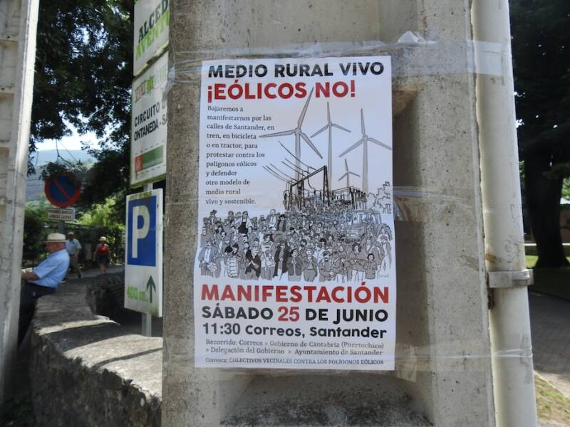 We zitten hier op het platteland van Cantabria, precies tussen 2 plekken in waar we vorig jaar gestaan hebben. De ene ligt aan het Ebromeer en de andere is Pedrosa de Valdeporres waar we vorig jaar gieren hebben gespot. Leuk om daar weer heen te gaan, ware het niet dat het morgen daar ook 36º wordt. Dus gaan we maar naar zee toe, louter en alleen omdat de temperaturen daar aangenamer zijn als we maar zuidelijk van Bilbao blijven waar het 38º wordt vrijdag. We hebben het veel over het weer maar de situatie is dan ook voor de Spanjaarden zelf erg uitzonderlijk. Er wordt gediscussieerd over een versnelde energietransitie tegen klimaatverandering , aan de andere kant is er verzet tegen de vele windmolens die hier staan en geplaatst gaan worden. Ook hier in het dorp affiches op verschillend plekken waarin wordt opgeroepen om op 25 juni in Santander te gaan demonstreren.