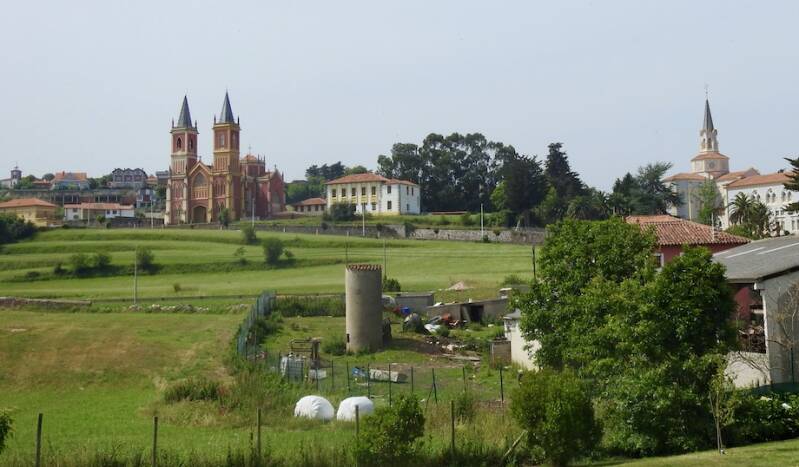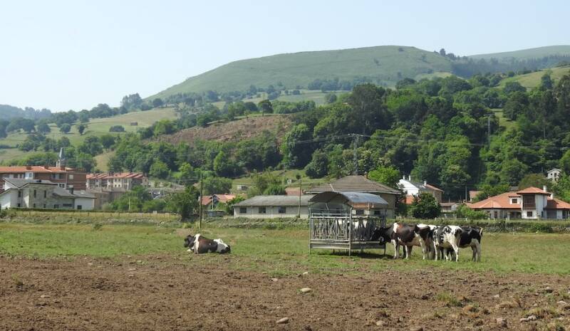 We kijken uit op het dorp Cóbreces, , de buurman van de cp heeft een lekker rommelig erf
