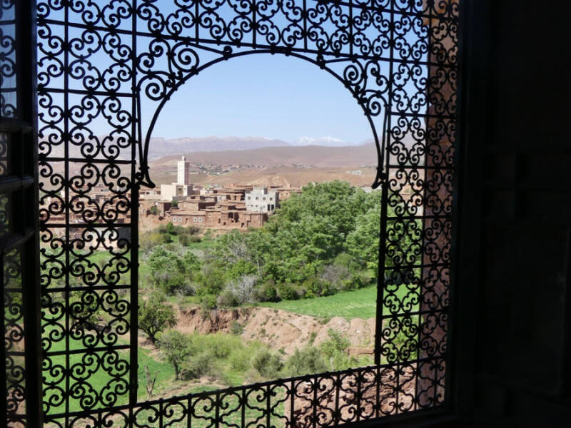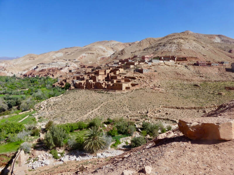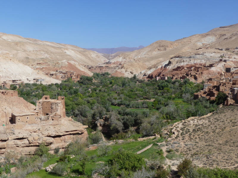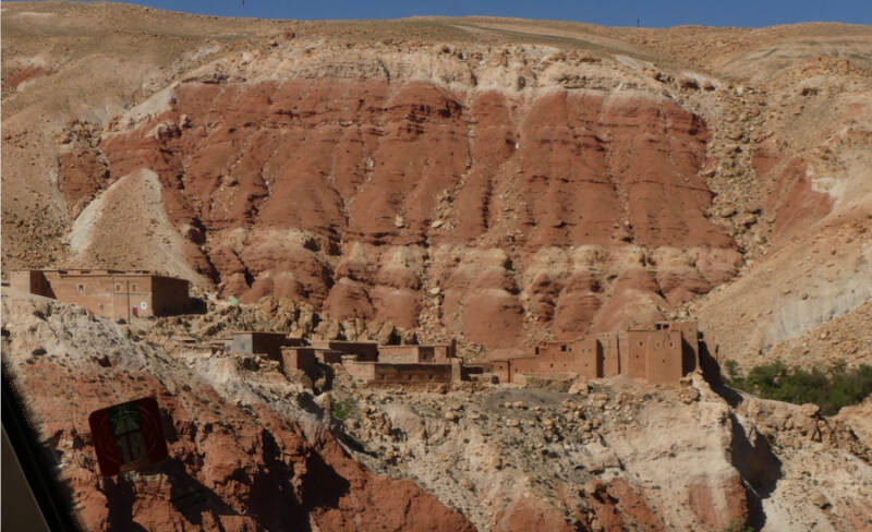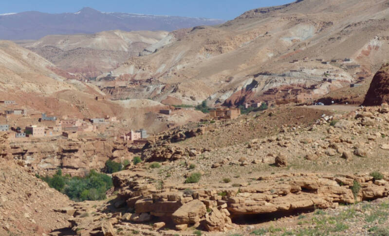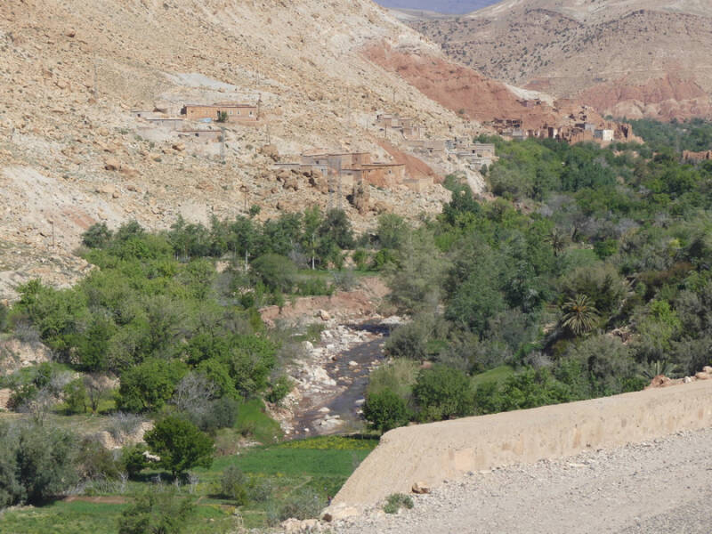 Toen begon een een van de mooiste routes die we dit jaar gereden hebben, een ritvan zo’n 50km naar Telouet, het grootste deel boven een riviertje die in een prachtig dal, soms door een kloof onder ons stroomde. We zijn menigmaal gestopt om foto’s te maken, vogelgezang klonk vanuit de diepte uit de struiken en bomen langs de rivier. Het was een schitterend bergachtig landschap met wisselende kleuren van de bergen. We zijn in de Hoge Atlas en we waren verbaasd over de vele dorpen en huisjes die we tegenkwamen, het zal wel komen omdat het vanwege de rivier vruchtbare grond is. De dorpen harmonieerden prachtig met de omgeving omdat er leem gebruikt wordt uit de directe omgeving, soms was het een zoekplaatje om de huizen tegen de vaak bruinrode bergen te zien.