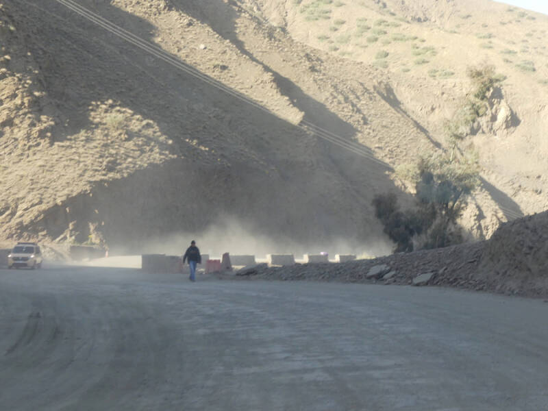We waren al snel op de N9 en begonnen aan de klim van de 2260m hoge pas. Dat ging vrij vlot en de weg was na de top zelfs een stuk vernieuwd, hij was 3-baans geworden. Echter het landschap veranderde niet alleen, ook de weg werd helaas telkens onderbroken door werkzaamheden waardoor we stukken piste moesten rijden over een afstand van zo’n 30km. Er werd echter nauwelijks aan de weg gewerkt, erg veel machines en vrachtwagens stonden op een parkeerplaats, waarschijnlijk omdat het zondag was.