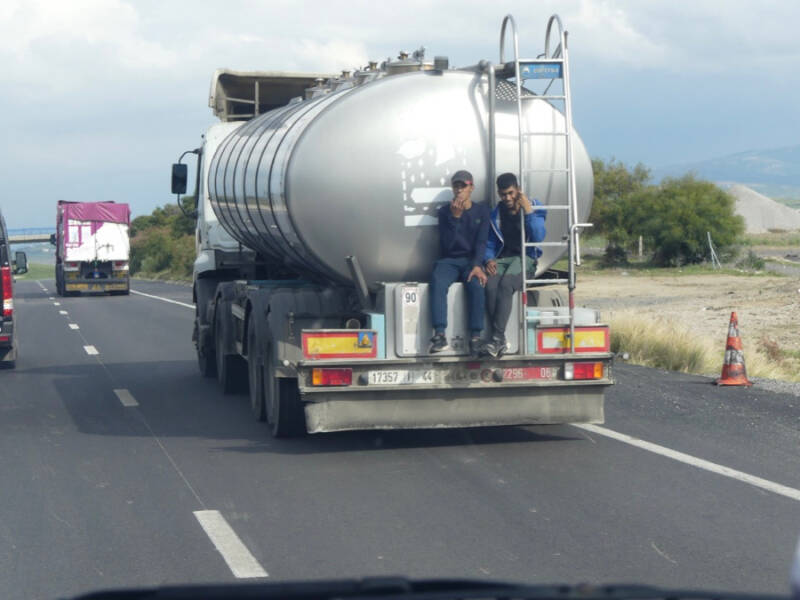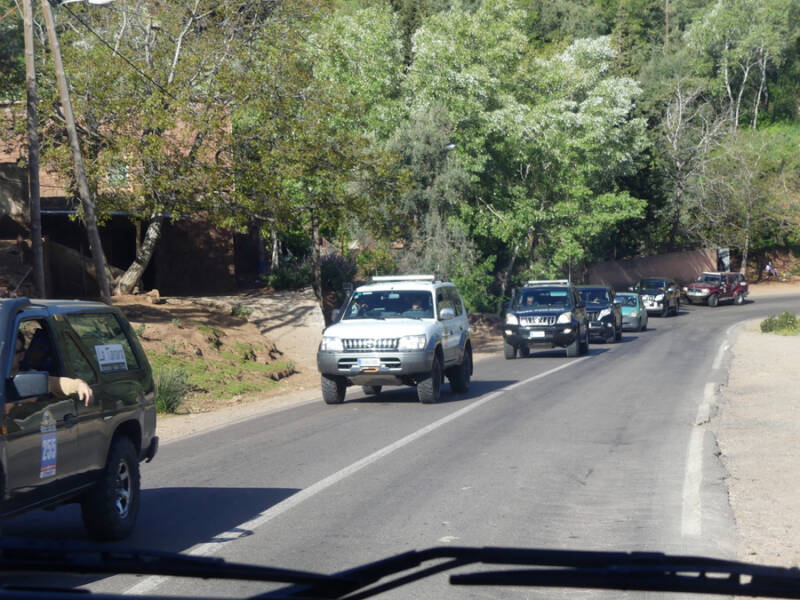 De werkzaamheden waren een van de redenen om vroeg te vertrekken, de andere was de Spaanse furie. Die kwam omstreeks 9.30 op gang in de vorm van honderden 4x4 die telkens in groepjes ons tegemoet raceten, af en toe afgewisseld door een groepje Portugezen, er moet zowat geen 4x4 meer te vinden zijn op het Iberisch schiereiland. Voor de 2e keer deze vakantie in Marokko een bijna-aanrijding: een Spaanse 4x4 haalde in in een bocht en kon door krachtig remmen een frontale botsing met ons voorkomen, medeweggebruikers toeterden en maakten verontwaardigde gebaren richting de Spanjaard.
