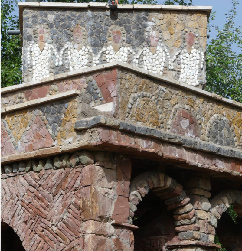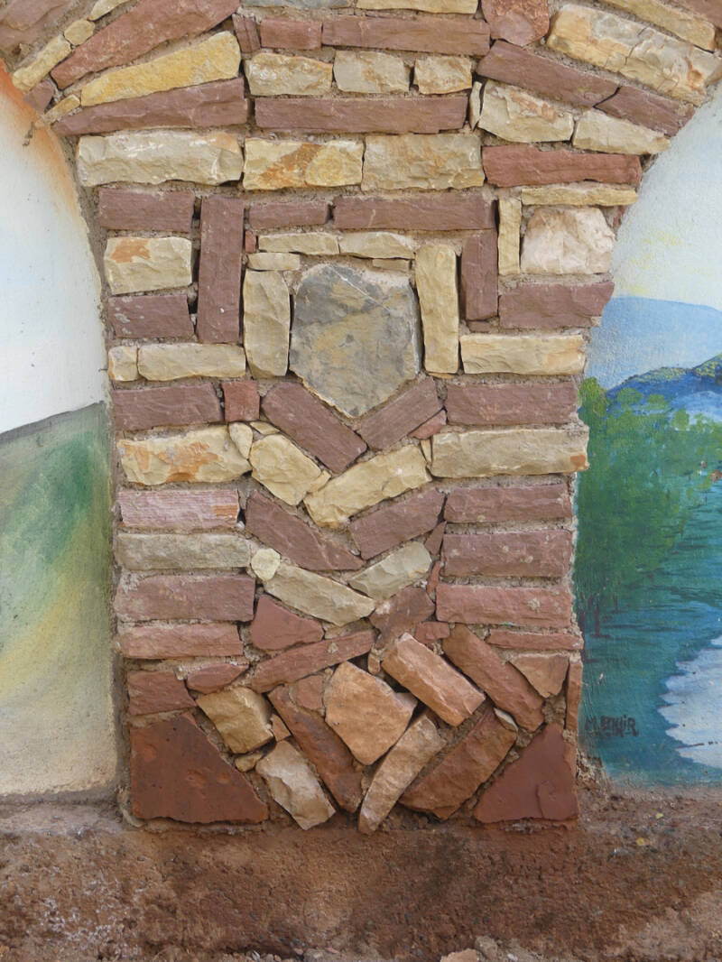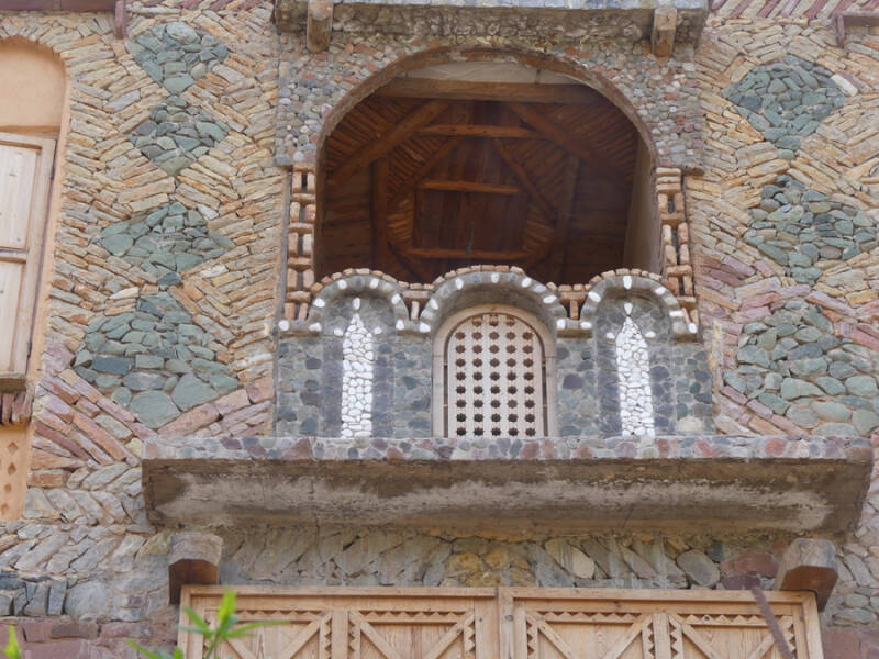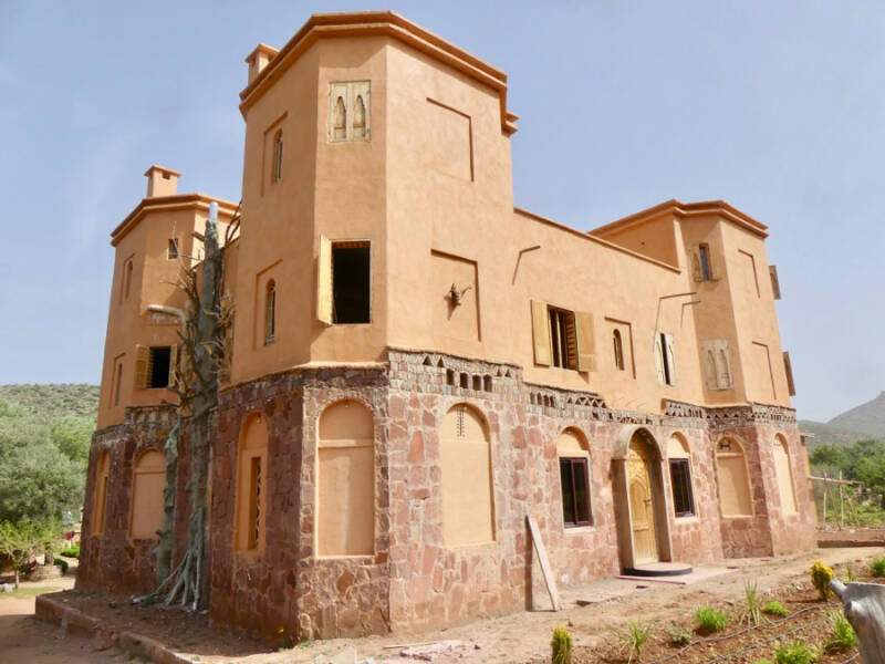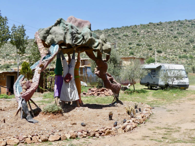 Bij Aït Ourir de afslag genomen naar Demnate, de weg was gedurende de resterende 70km vrijwel vlak omdat we de Hoge Atlas achter ons hadden gelaten. Bij Demnate werd het landschap weer heuvelachtig en in Demnate was een hele grote souk die erg druk bezocht was. Wij zijn stapvoets doorgereden tot we op de weg naar onze bestemming kwamen, die 7km buiten Demnate gelegen is. We staan op een parking , eigenlijk in de tuin, van het hotel Riad Aghbalou die een wel heel bijzondere eigenaar heeft. De man is kunstenaar en heeft in zijn grote tuin kunstenaars de vrije hand geboden om hun gang te gaan. Alles is nog in ontwikkeling, hij heeft zelf een beeld gemaakt die de bergen en berbervrouwen moet voorstellen. Er is een klein amfitheater in aanbouw voor muziekuitvoeringen en andere culturele evenementen, er is een fontein met 7 poorten die de dagen van de week symboliseren. En hij heeft samen met kunstenaars een huis gebouwd, zonder architect, volgens eigen ideeën, hij noemt het 'het kasteel'.