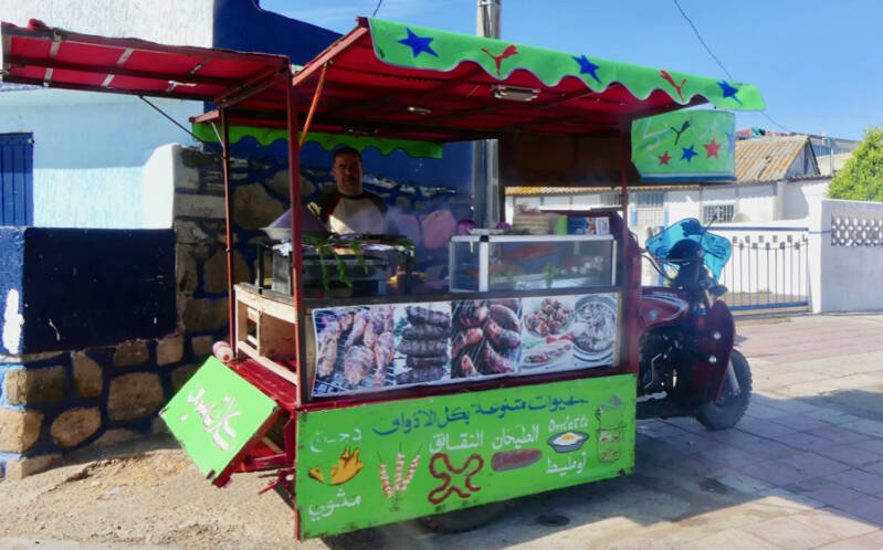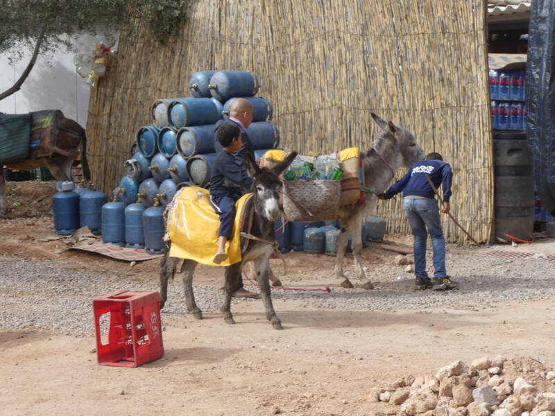 Vanmorgen nog wat boodschappen gedaan in Moulay Bousselham. We hebben onze gasfles nog een keer omgeruild, hij was zo goed als leeg, voor 42Dh (€4,-) hebben we weer een volle fles. En we hebben nog wat groente en fruit gekocht, in Asilah staan we verder van de stad af en zouden we een boodschappenwagentje moeten gebruiken. In Kenitra hadden we trouwens bij de Marjane nog wat artikelen gekocht die we voor een deel mee nemen naar huis, oa body lotion met Argan en boulettes, dat zijn blikjes kruidige sardineballetjes. En hier voor op brood Marokkaanse blauwaderkaas en gerookte kalkoenham met peper.