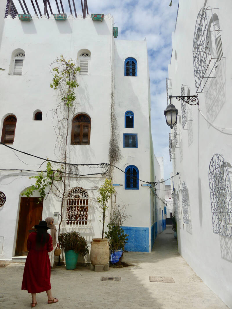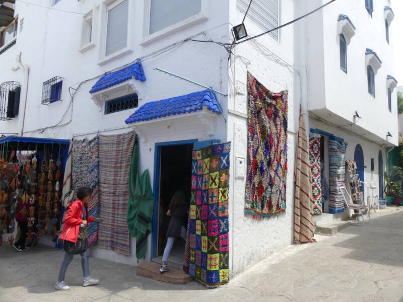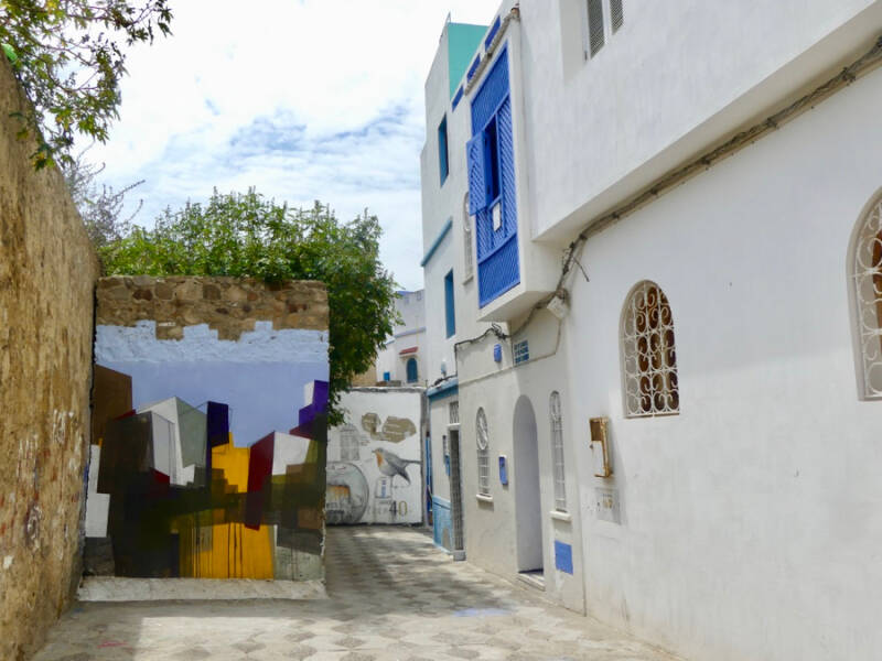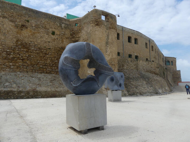 Asilah, daar zijn we eerst naar toe gereden vanmorgen, nog even het leuke stadje in, er kwam een onweersbui aan toen we vertrokken maar die waren we voor. Het bleef verder droog en de zon kwam er ’s middags goed door. We hebben wat rond gewandeld maar het was kneiterdruk met vooral Spanjaarden. Waren er altijd al wel muurschilderingen die om de zoveel tijd door andere artiesten gemaakt werden, bij de haven hadden ze geen onaardige sculpturen geplaatst. Asilah heeft een klein centrum, er zijn veel souvenirwinkels en galerietjes, verder is de kleur blauw en wit, de huizen dan. We zijn voor de laatste keer gaan eten, o.a vistajine met stukjes witvis, inktvis en kleine garnalen. Het was lekker maar had wat beter gekruid kunnen worden.