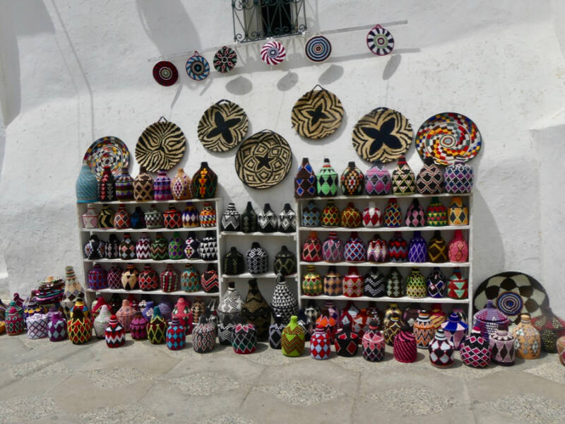 Bij de ingang van de medina in Asilah, allemaal gehaakte voorwerpen te koop