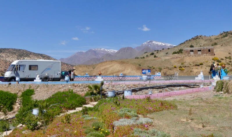 Via een goede, tamelijk bochtige weg zijn we de Midden Atals ingereden, vlak voor onze bestemming zagen we een renvogel maar we konden niet stoppen. We staan nu op de camping Amalou achter het gelijknamige café-restaurant, vlakbij de watervallen van Ouzoud.