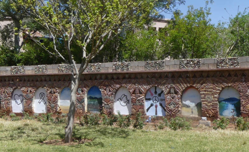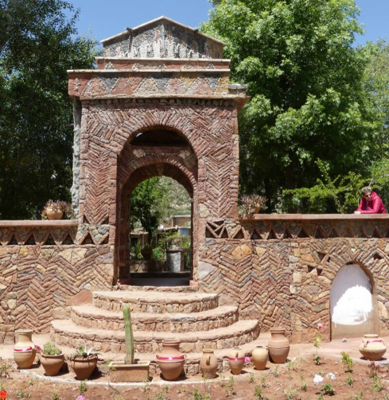 Er is een biologische olijfoliemolen, er zijn diverse tuinen met aromatische en geneeskundige kruiden, een winkeltje waar kruiden en olijfolie wordt verkocht, alles bio. Er is een vredesmuur gebouwd, er komt een museumpje om de eenheid van Joden, Moslims en Christenen te benadrukken, er zijn ateliers zoals een pottenbakkerij en houtbewerking en er komt een weverij. Hij is een promotor van de Berberculuur in de bergen. We staan hier heerlijk in dit kleine paradijsje, waar je een nachtegaal hoort zingen en grauwe buulbuuls kwetteren , het is ook nog eens kosteloos.