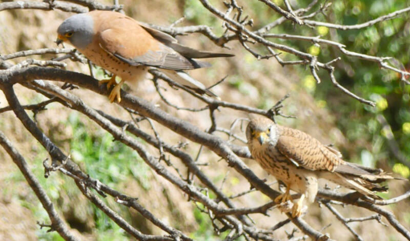 Kleine torenvalken, mannetje en vrouwtje, deze soort komt in Europa niet voor, hier broedt een grote kolonie in de rotswand.