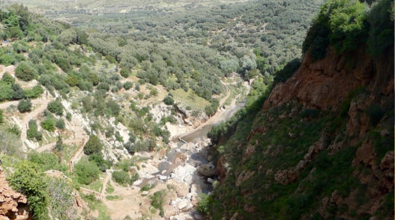 Een blik de kloof in waar het riviertje verder stroomt na de waterval