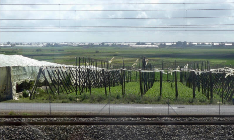 We zijn weer via de autoroute gereden, het is hier een landbouwgebied en als je via de N1 rijdt heb je kans op veel modder op de weg na al die regen. Nu reden we tussen het plastic door , er is oa bananenteelt in kassen.