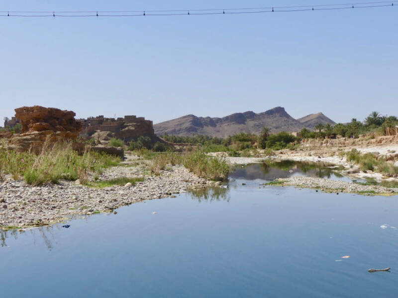 We zijn vanmorgen naar de Draa gewandeld, daar stond maar weinig water in, liever gezegd, stroomde er langzaam doorheen. Het was een wandeling van 3,5km. toch deden we er 2 uur over. Op de camping al hebben we kennisgemaakt met Ingrid, Ben was gisteren al bij ons geweest. Even bijgepraat en op de terugweg van de Drâa kwamen we Folkert en Nel tegen die we in Foum Zguid al hadden ontmoet. Ze staan op de camping aan de andere kant van de rivier samen met hun vrienden Herman en Ans die we even later tegenkwamen. Dan nog in een paar sieradenwinkeltjes geweest waarvan we sommige handelaren nog kennen. En naast het gebruikelijke ‘allemachtig prachtig’ was er nu een jonge ADHD-achtige verkoper, die niet alleen telkens ‘geweldig’ maar ook ‘slagroom met, lekker, lekker’ riep. Maar het was een leuke ochtend zo.