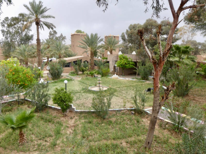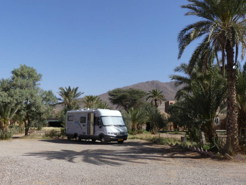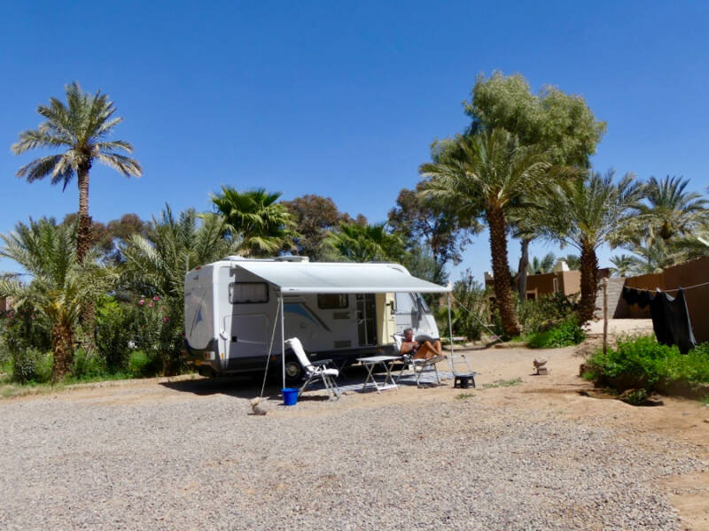 We waren binnen een uur op camping Khaima Park, we hebben hier al vaak gestaan. Het is een tamelijk kleine, knusse camping en hoewel ze in de loop der jaren veel hebben verbeterd zie je wel achterstallig onderhoud. Er zijn nu betere staanplaatsen op grind, in het begin was het rul Saharazand. De wc’s zijn smerig, die zijn al een tijdje niet schoongemaakt. Er staat hier nog een Duitse buscamper en vanavond kwamen er nog 2 Duitse jeeps.