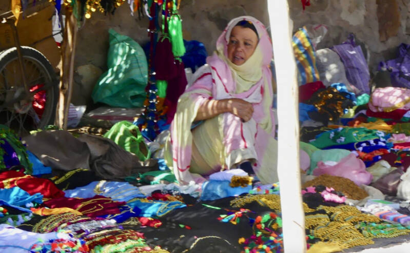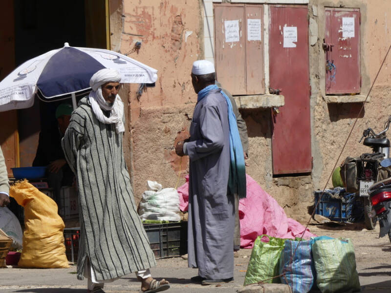 Vanmorgen aan het eind van de ochtend zijn we voor het eerst naar de souk op de nieuwe plaats gewandeld. We waren er al wel een paar maal geweest maar dat was als we met de camper op marktdag vanuit de richting Foum Zquid in Zagora kwamen. De afstand om te lopen viel mee , via een geitenpaadje kwamen we in een half uur op de souk. Via een poort met aan weerskanten kleine torens in kasbah stijl, kwam je op de souk. De souk in Zagora is groot en omdat het niet druk was leek het nog wel groter. Als je binnenkomt is meteen rechts de groente/fruit afdeling waar ook veel kraampjes met kruiden te vinden zijn en links is een aantal kramen waar vrouwen hun huisvlijt, zoals geborduurde Drâadoeken en andere kledij alsmede kruidenbundeltjes aan de vrouw/man probeerden te brengen. Daarachter waren meerdere kraampjes met ‘Berber’sieraden, een aantal bekende handelaren begroetten ons vriendelijk.