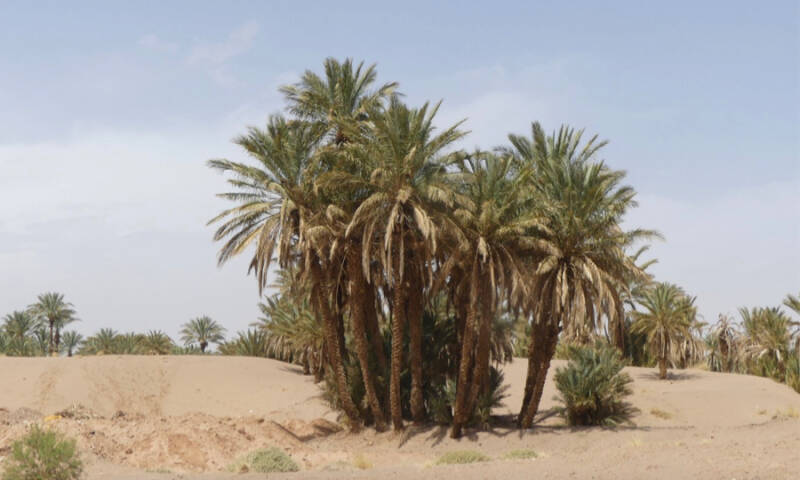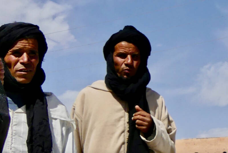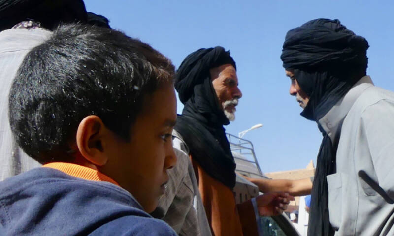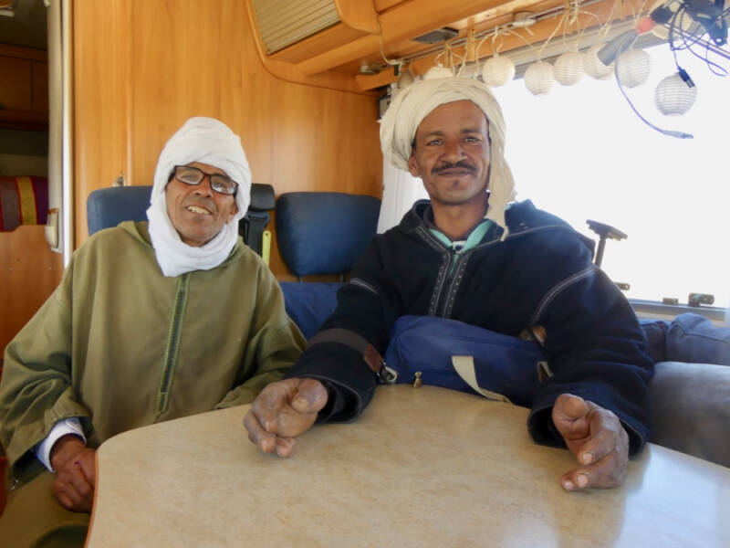 We hebben onderweg 2 lifters meegenomen, meer plaats hadden we niet anders waren het er wel 10 geworden. Er is geen openbaar vervoer en er rijdt hier maar heel weinig verkeer. Het waren 2 vrolijk kwebbelende boeren, Lahcen en Mohamed, die alleen een Berders spraken, hier in Zuid Marokko is dat het Tachelhit. Ze moesten in Zagora zijn en een wilde wel mee naar het nomadenfestival in Mhamid.