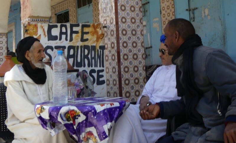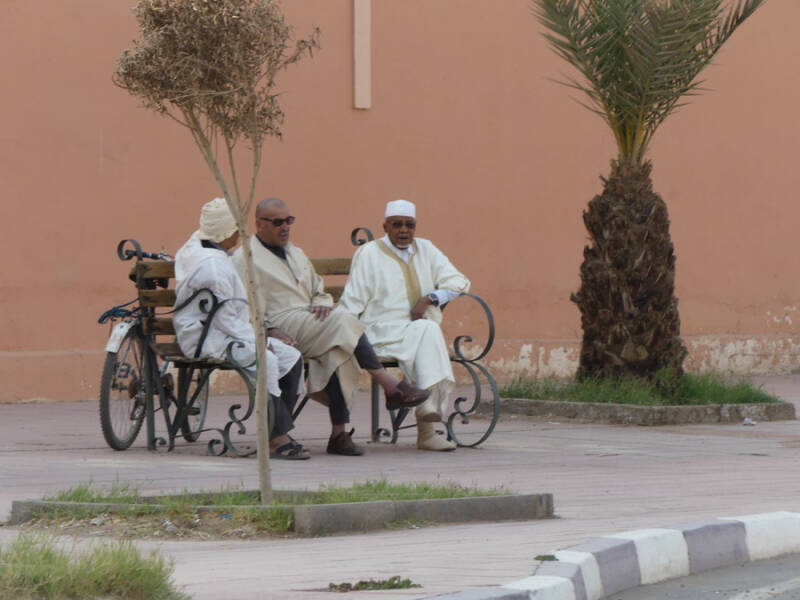 Vanmiddag kwamen hier Riet en Francis, we hebben elkaar eerder ontmoet in Tafraout, zij komen nu uit M’hamid. Francis zou graag het festival bijwonen, dat wordt echter volgend jaar. Toen we aan het eind van de middag Francis en Riet even gedag gingen zeggen liep dat spontaan uit op een apéro, we hebben heel leuk nader kennisgemaakt.