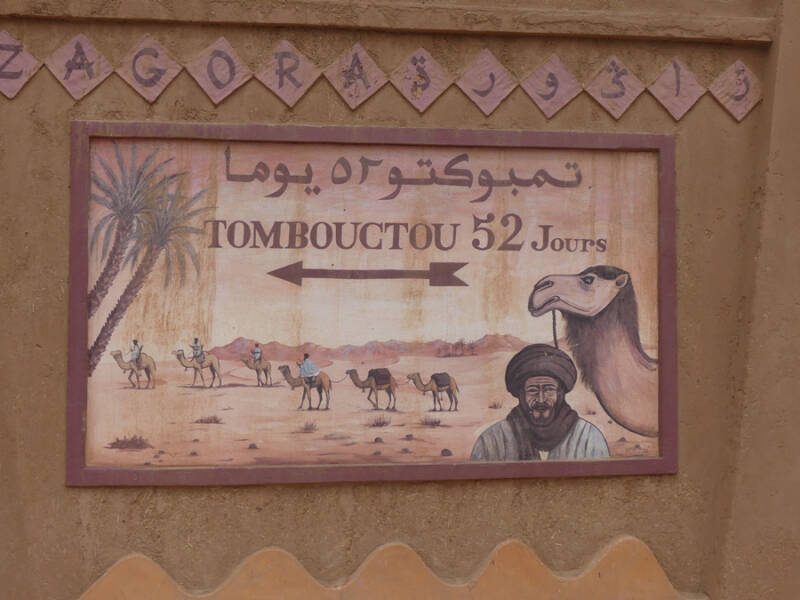 In het verleden was Zagora een karavaanstad, het was het centrum van de karavaanhandel , van hieruit was Timboektoe in 52 dagen te bereiken zoals het meest gefotografeerde ‘verkeersbord’ hier ook aangeeft. Ook Timboektoe ,in Mali ,speelde een belangrijke rol in deze handelsroute waarin van noord naar zuid en omgekeerd door Toearegs en andere nomadenstammen over grote afstand door de woestijn de handelswaar werd vervoerd. Deze handelswaar bestond uit zout die vanuit Marokko zuidwaarts werd vervoerd en geruild werd tegen, goud, zilver, slaven en wapens die dan weer noordwaarts werden getransporteerd via kamelen. Overigens kwamen de karavanen van verder dan Marokko bv uit Egypte en brachten ook korans mee zodat de islam zich ook ten zuiden van de Sahara kon vestigen. Ook Marrakech en Fes lagen langs de karavaanroute. De karavaanroute is van belang geweest voor de ontwikkeling van Zagora en omstreken.