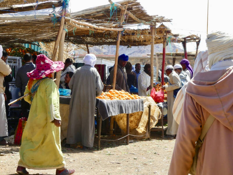 We zijn vanmorgen naar de souk in Foum Zguid geweest, een levendige en kleurrijke souk zoals meestal in (Zuid) Marokko. Er was een afdeling met vooral plastic, plastic tuinstoelen voor 30Dh, en andere “Blokker’spullen. Onze belangstelling ging it naar de groenteafdeling waar de boontjes en de mandarijnen goedkoop waren €0,14 voor een kilo mandarijnen hadden we nog niet betaald.