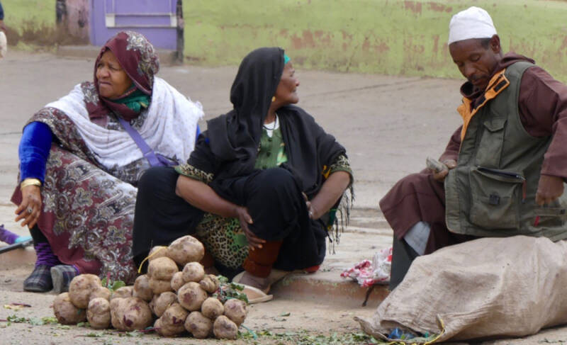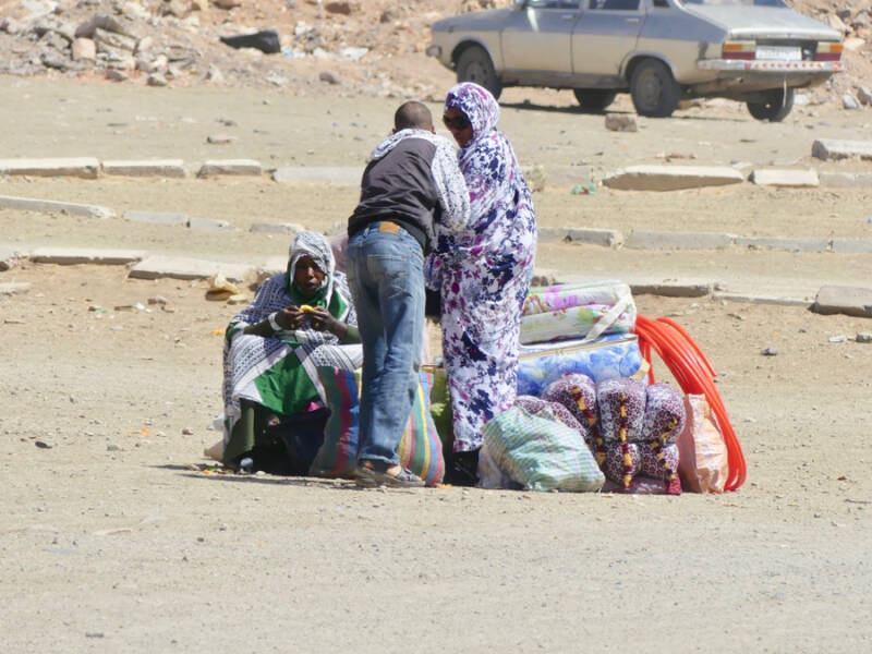 Zodra de toeristen hier zijn gedropt om een foto te maken, worden ze 'bestormd' door handelaren, herkenbaar hier aan hun blauwe tulbanden