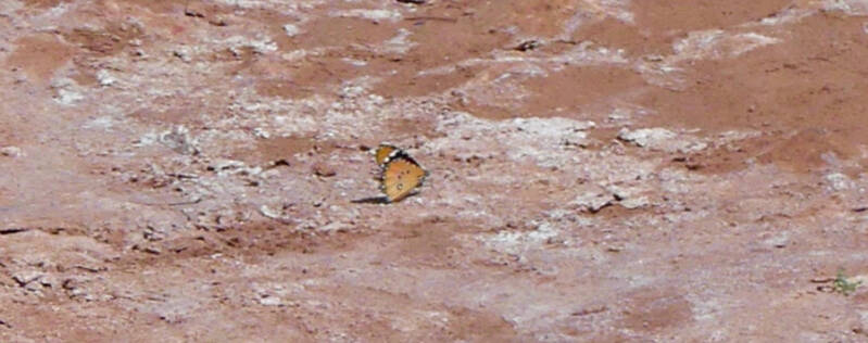 Vanmorgen zijn we na bijna een week uit Tata vertrokken, het is ons daar prima bevallen. Via een goede 2-baansweg met middenstreep, was het 70km naar Tissint. De weg voerde door een tamelijk vlak landschap met aan weerszijden bergketens, waaibomen en af en toe een oase met een dorpje. 10km voor Tissint werd het een mooi landschap, door erosie waren er een beetje bizarre vormen ontstaan. Vlak voor Tissint moesten we stapvoets rijden wegens wegwerkzaamheden en toen zagen we een vlinder, verrek dat lijkt wel een monarchvlinder.