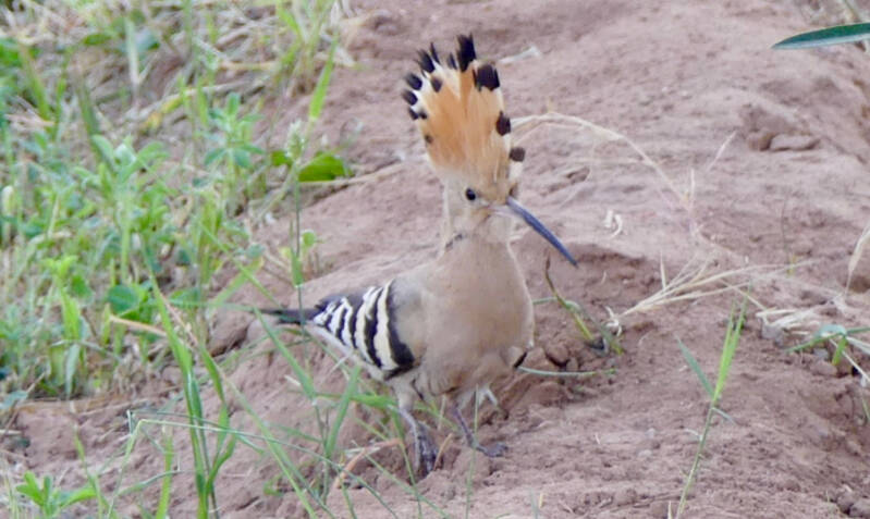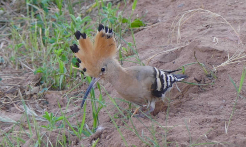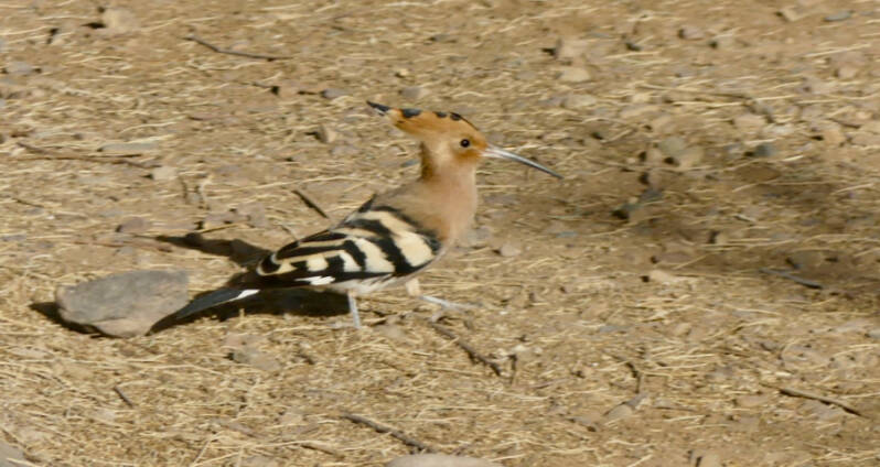 We hebben eigenlijk nooit last van muggen in Marokko, wellicht dat het te droog is voor dat soort insecten. Toch is gisterenmiddag Everdien door en of ander insect gestoken, ze heeft nu last van een bult, wat heet , een plakkaat van wel 6cm doorsnee op haar been, het lijkt een allergische reactie. Dat weerhield haar er niet van om , toen ik een paar baguettes ging halen, een hop te fotograferen die naast de camper zat, mooi met zijn kuif omhoog, hoe kan men ooit een punkkapsel een hanenkam hebben genoemd.