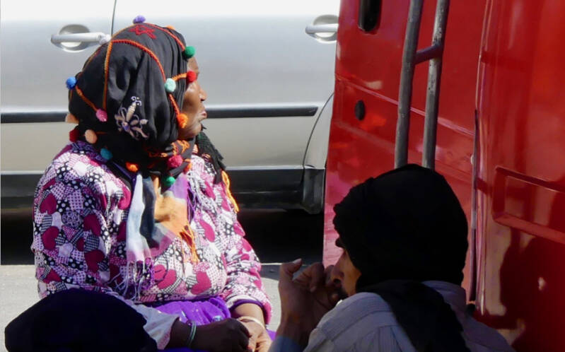Je ziet in het zuiden van Marokko nogal wat mensen met een heel donkere huiskleur, dit zijn afstammelingen van de slaven uit West Afrika die in vorige eeuwen hierheen werden gevoerd, met name vanaf de 16e eeuw, om het leger van Marokkaanse sultans te versterken. Deze mensen worden Haratin genoemd, waar het woord van afstamt hebben we niet kunnen ontdekken. De huidige Haratin hebben zich veelal vermengd met Arabieren en Berbers en ze werken vooral in de landbouw in de oases. Over het algemeen hebben ze een lagere status dan de overige bewoners van het zuiden en doordat ze in laag betaalde baantjes zitten, kennen ze ook meer armoede. Aan de andere kant worden aan hun soms magische en helende krachten toegeschreven, er heerst nogal wat bijgeloof in Marokko. Sommige Haratin zijn naar Marrakech getrokken en zijn nu geen leerlooier meer maar zijn goochelaar, danser of muzikant op het beroemde Djemaa el Fna plein.