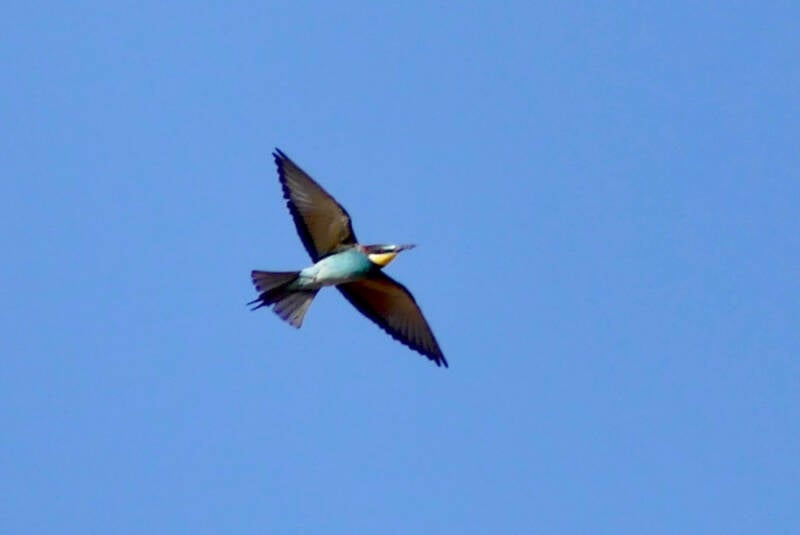 In het begin van de avond vloog er weer een groepje bijeneters over, een foto genomen die, hoewel de vogel eigenlijk nog te hoog vloog, de foto toch maar hier neergezet, in de hoop dat we een betere kunnen maken binnenkort, maar je weet maar nooit.