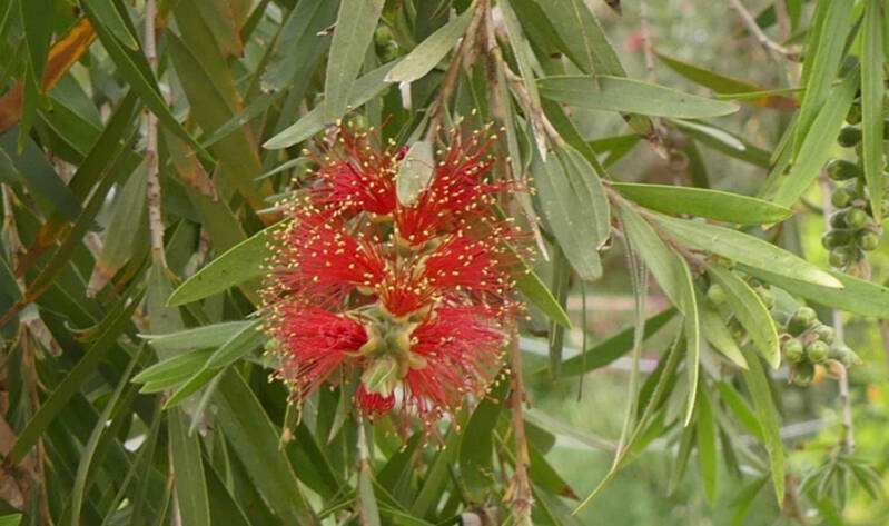 Callistemon citrinus, oftewel lampenpoetser, flessenrager. Als struik of boom, hier de bloem van een jong boompje op de camping.