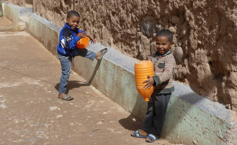 Vandaag is de grote souk hier in Zagora. Tot voor een paar jaar was deze midden in de stad bij de moskee en achter de hoofdstraat, nu ligt hij een paar km buiten de stad. We zijn er niet naar toe gegaan omdat we denken dat het nu één grote modderbende zal zijn. Normaal is het zanderig en stoffig maar vannacht is er tussen de 8 en 10mm regen gevallen, tot vreugde van de Marokkanen hier. Het regent nl. niet zo vaak in de Sahara en de matige regen van vannacht was zeer welkom voor de landbouw. Hoewel er al veel is verbeterd aan de infrastructuur in Marokko, ontbreekt het meestal nog wel aan een goede afwatering. Er zijn geen putten langs de weg waar het water in kan lopen, het stroomt gewoon langs de weg naar een lager gelegen gedeelte. Zo ook in de oude wijk, de ksar, waar we vanochtend door wandelden , beetje triest om te zien die modderboel .Pas vlakbij de Drâa is er een put waar het water dan instroomt en vervolgens de Drâa in. Het waterpeil in de rivier was niet noemenswaardig hoger dan gisteren trouwens. Ze zijn bezig om de Drâ wat te kanaliseren door het bouwen van muren zodat bij hoog water de rivier in de bedding blijft en niet overstroomt, een voorbeeld van verbetering van de waterhuishouding in Marokko.