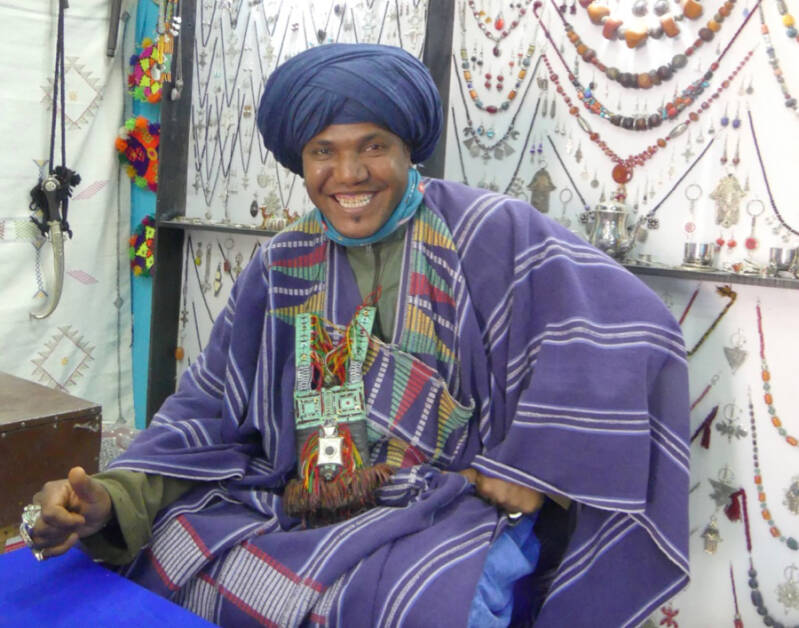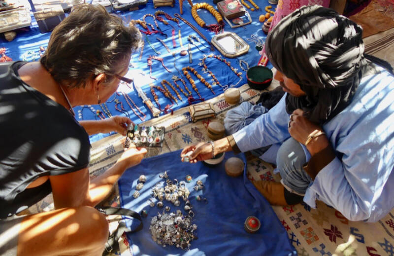 Omdat we hier al jaren komen, kennen we natuurlijk de nodige handelaren en omgekeerd ook, we hebben er minder last van. Vaak wordt je aangesproken op uiterlijke kenmerken zoals sieraden die je draagt of ze horen dat je uit Nederland komt: “Hallo Holland, alles goed? Kijken, kijken, niet kopen , kom maar binnen, just for a look. Un beau collier, komt die uit Mali?” Ben je eenmaal binnen, dan volgt er een vast ritueel , ga zitten, kopje thee? Weldra komt er na wat small talk in het Frans of Engels een kistje op tafel met in doeken of zakjes sieraden, in ons geval meestal ringen omdat ze al gezien hebben dat we die dragen. Natuurlijk komen ze van een Berbervrouw, een weduwe, die om te overleven haar sieraden moest verkopen.