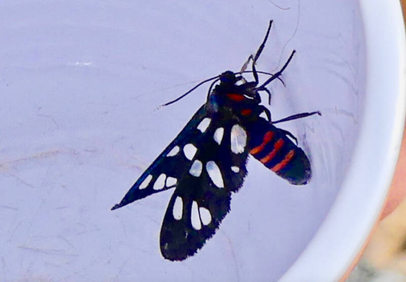 Dezelfde vlindersoort als gisteren in het waterbekertje zat, nu veel duidelijker te zien, via Toon kennen we de Latijnse naam, Amata alicia, het is een wespmot.
