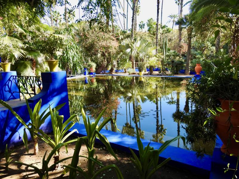 Jardin Majorelle bestaat sinds 1923 en is gesticht door de Franse schilder Jacques Majorelle die verliefd was geworden op Marokko. Majorelle liet een art deco studio bouwen door een architect met pergola’s en helderblauwe kleuren. De tuin werd in 1955 open gesteld voor het publiek en wordt druk bezocht. Yves Saint Laurent kocht het huis in 1980 samen met zijn vriend Pierre Bergé en zorgde ervoor dat de tuin werd gerestaureerd en dat er nieuwe planten werden toegevoegd. Er zijn nu talrijke cactussoorten, yuca’s, er staan meer dan 400 palmen en diverse bamboesoorten. Verder zijn er nog exotische planten maar helaas in in de winter stond er , afgezien van de bougainville en een enkele cactussoort, niets in bloei. Dat was jammer maar wat het bezoek toch enigszins deed tegenvallen was de drukte. We hoefden niet al te lang in de rij te staan want we waren al een bus Japanners voorbij gelopen die toch druk waren om iedereen, vooral zichzelf, en alles te fotograferen op de weg naar de tuin.